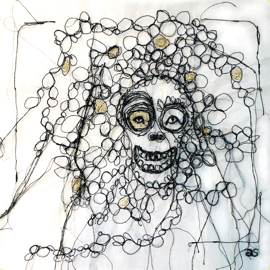 Portrait sans peau, vanité illustrant la question de notre regard sur la vie, broderie noire et or à bras libre sur organdi blanc, série « même pas peur », 25×26 cm.