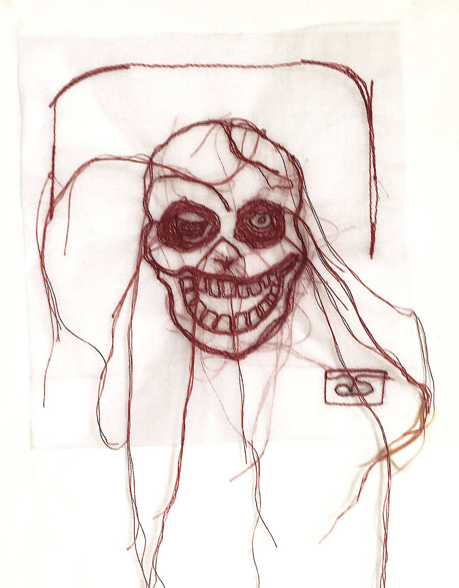 Portrait sans peau, vanité, broderie rouge à bras libre sur organdi blanc, série « même pas peur », 16×16 cm.
