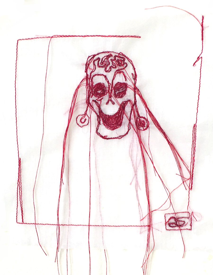 Portrait sans peau, vanité, broderie rouge à bras libre sur organdi blanc, série « même pas peur », 16×17 cm.