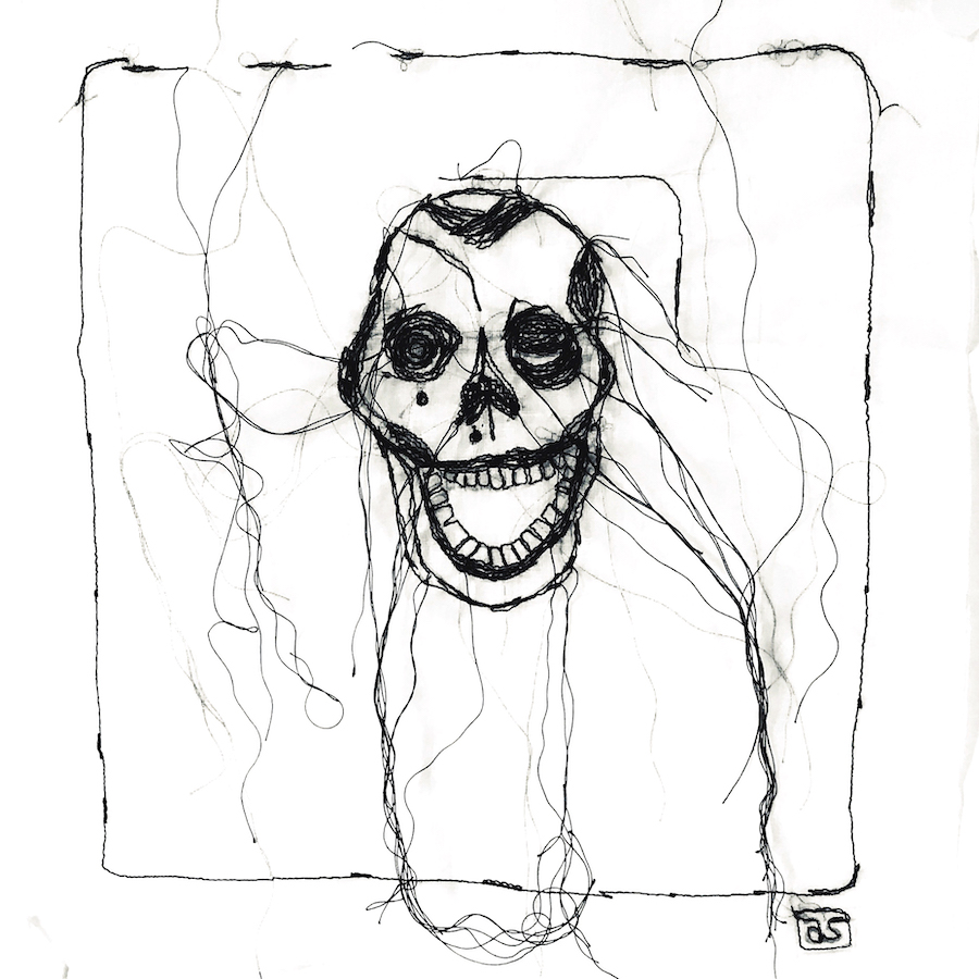 Portrait blanc sans peau, vanité illustrant la question de notre regard sur la vie, broderie noire à bras libre sur organdi blanc, série « même pas peur » 21×28 cm, quelle mouche te pique?