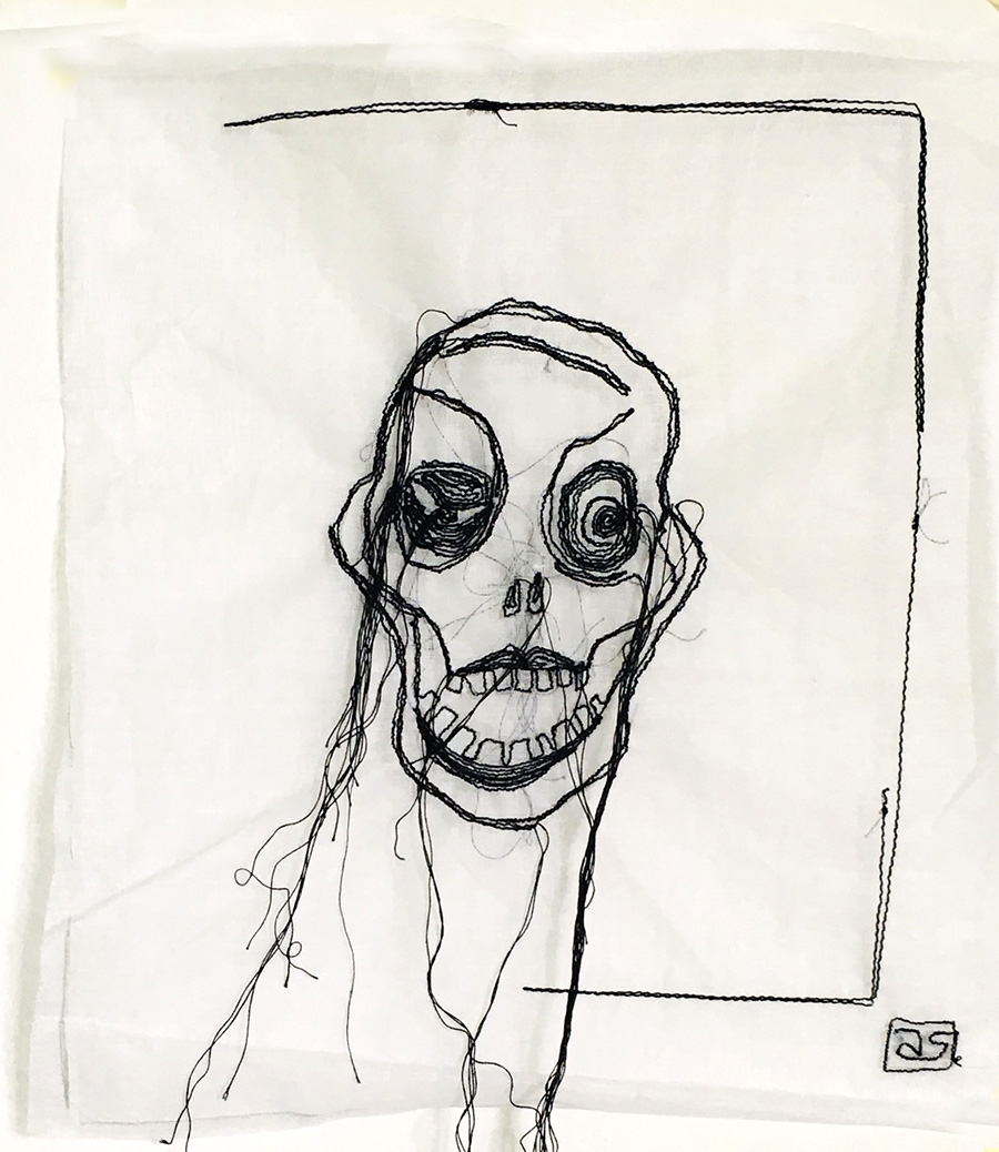Tableau textile, portrait sans peau, vanité illustrant notre regard sur la vie, broderie à bras libre noire sur organdi blanc, série même pas peur, 19×23 cm.