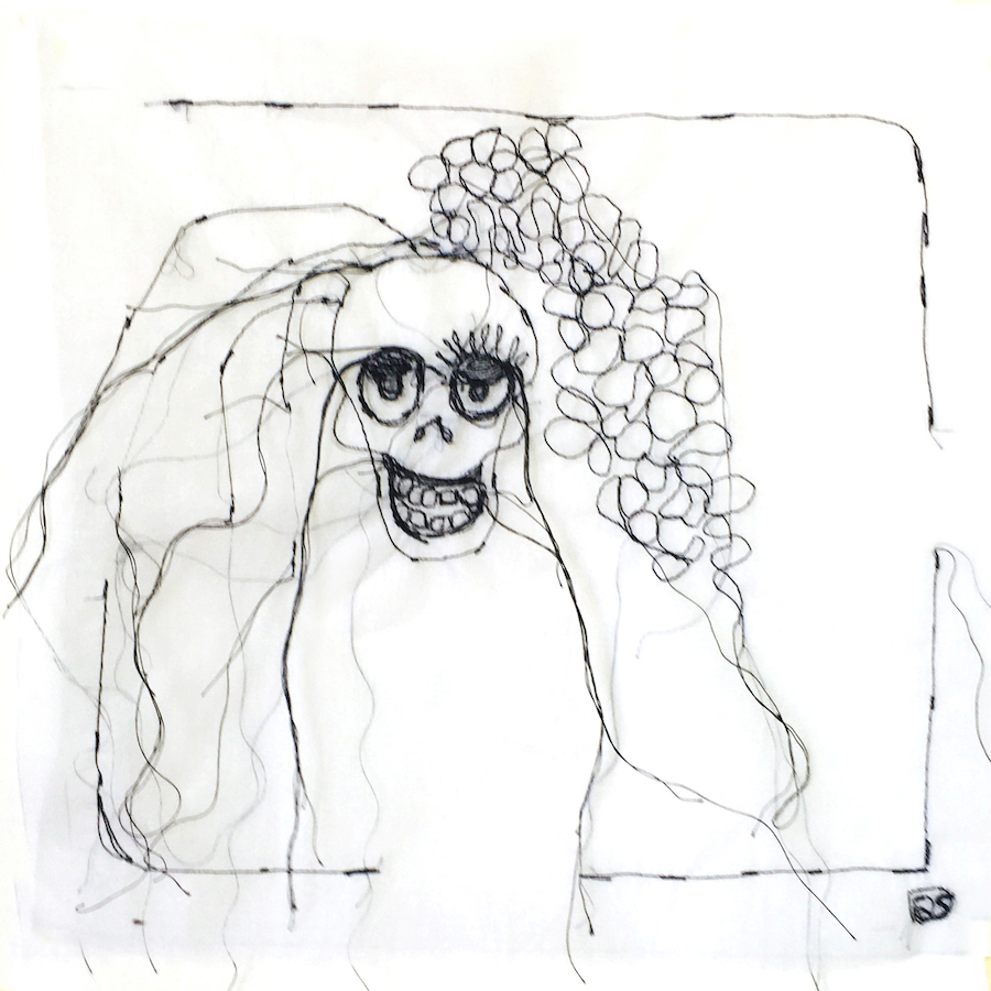Portrait sans peau, vanité illustrant la question de notre regard sur la vie, série » même pas peur », broderie noire à bras libre sur organdi blanc, 25×26 cm, la vie comme un thèatre, une blague