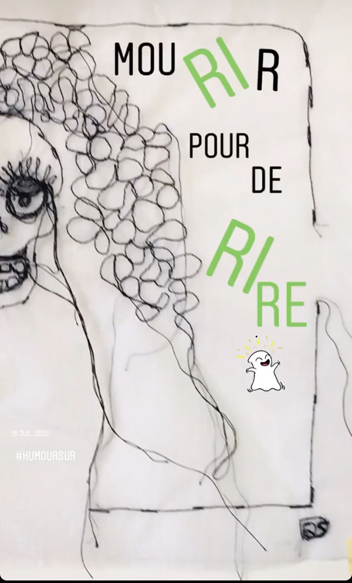 Vanité n°26, entité joyeuse, broderie sur organdi, 25×26 cm, 140 €, broderie « mourir de rire » + 20€, broderie « mourir de rire » en + 15 euros