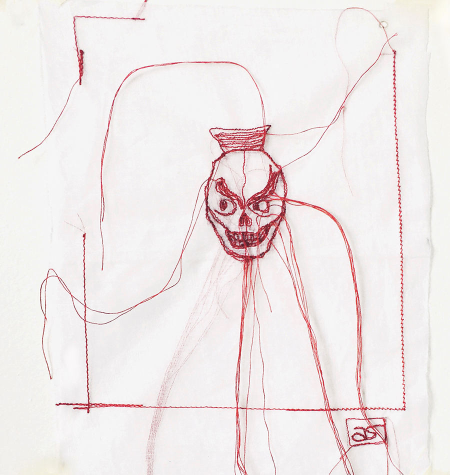 Vanité n°1, entité joyeuse au clin d’oeil, broderie à bras libre sur organdi, 20×22 cm, 90 €