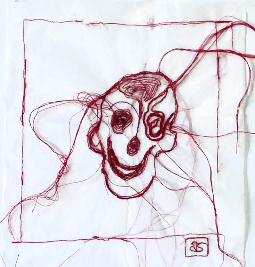 Portrait sans peau, tableau textile, vanité illustrant la question de notre regard sur la vie, broderie rouge à bras libre sur organdi blanc, série « même pas peur », 19×21 cm.