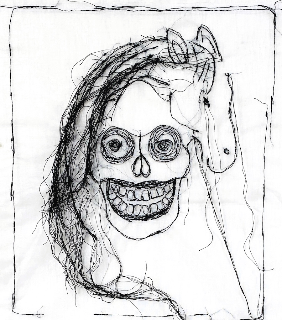 Portrait sans peau, vanité questionnant notre regard sur la vie, tableau textile, broderie noire à bras libre sur organdi blanc, série « même pas peur », 25×26 cm, être fougueux comme l’étalon