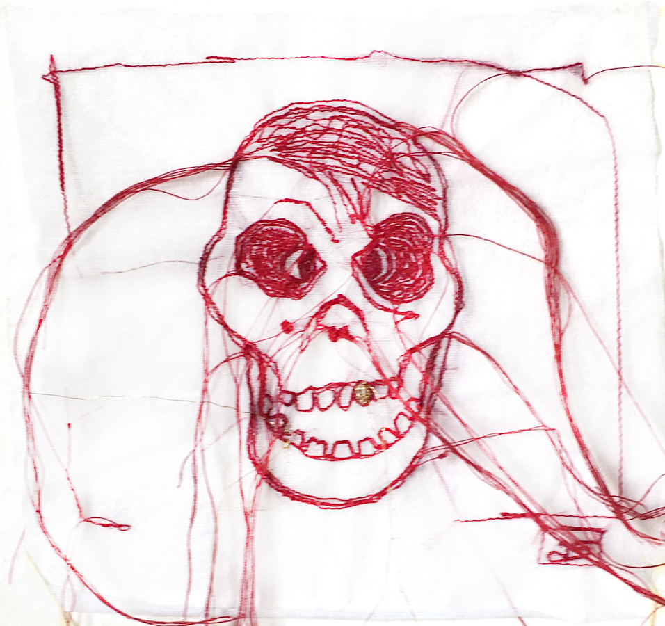 Portrait sans peau blanc, vanité illustrant la question de notre regard sur la vie, broderie rouge et or à bras libre sur organdi blanc, série « même pas peur », 16×15 cm.
