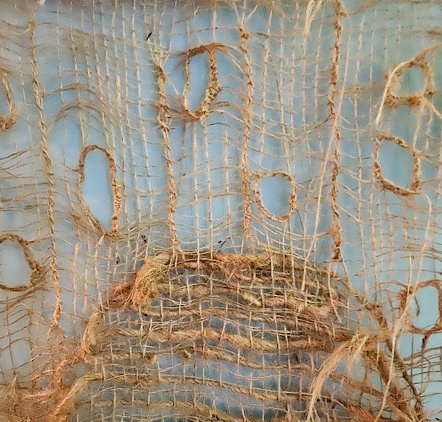 Une fois la broderie du mot inspiré terminée, je m’applique à déstructurer la toile du jute. Ainsi, je la déforme pour l’aérer, et je crée comme un souffle de respiration, des trous d’air, d’espaces. Ainsi je la rends encore plus légère, avec un courant d’air, elle pourrait s’envoler, et les fils se meuvent légers comme l’air .