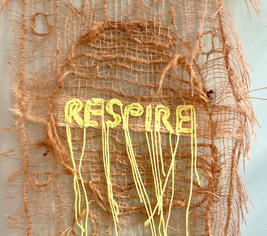 J’ai imaginé des petites tentures murales, en toile de jute brut, à suspendre. J’ai utilisé également du sisal et des fils de jute brut. Certains sont fins et les autres en grosse ficelle de jute brut. J’ai choisi le sisal comme support pour la broderie, car il est plus sec, et tissé plus serré que la toile de jute. J’ai effectué la broderie « RESPIRE » à la main, avec de la laine fluo jaune. Et de longs fils, ceux des broderies, pendent de chaque lettre, comme une respiration qui se prolonge consciemment. Puis j’ai tissé de gros fils de jute brut autour de cette bande « Respire ». Avec cet entremêlement de fils, je forme un cercle, symbole de l’infini, du mariage yin et yang, de l’expire et de l’inspire, aussi le cycle naturel de la vie.