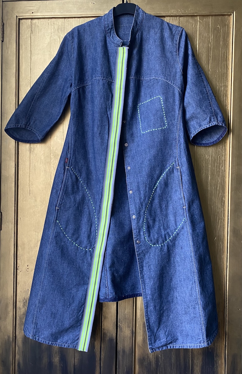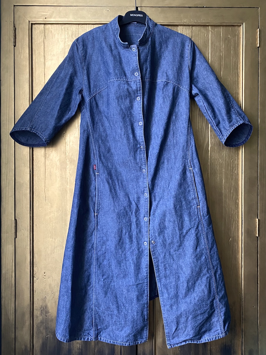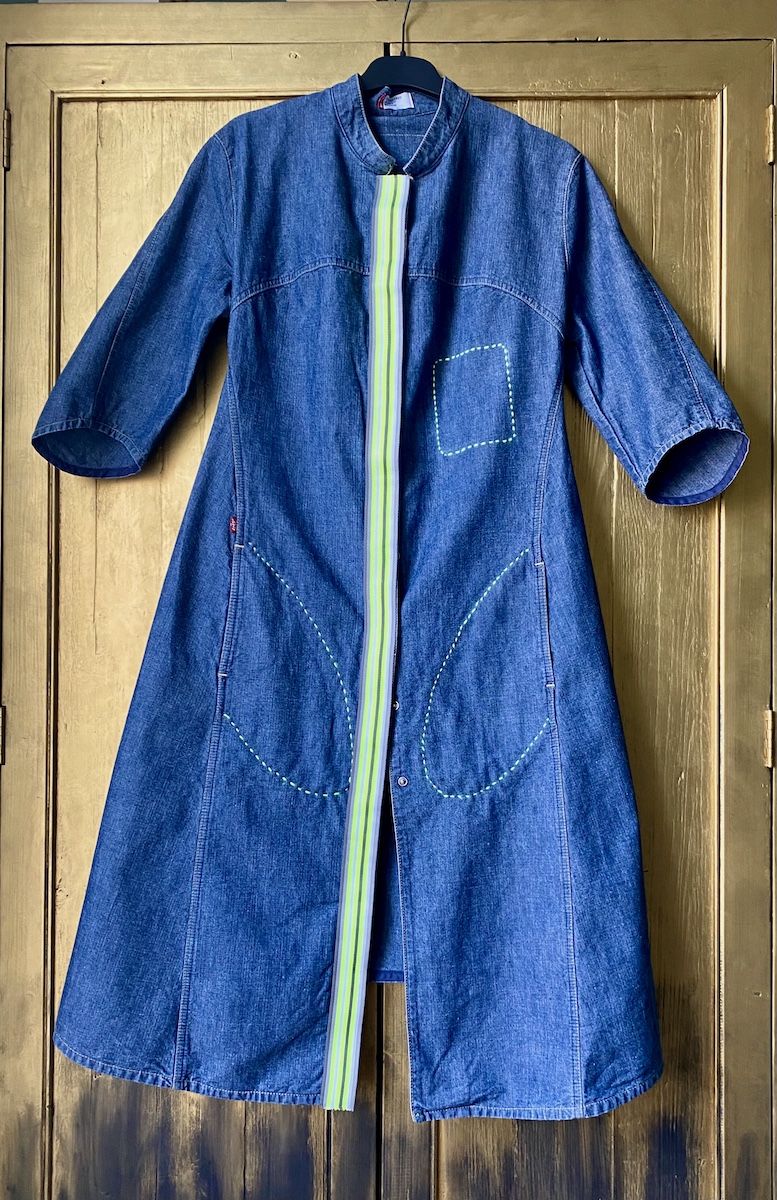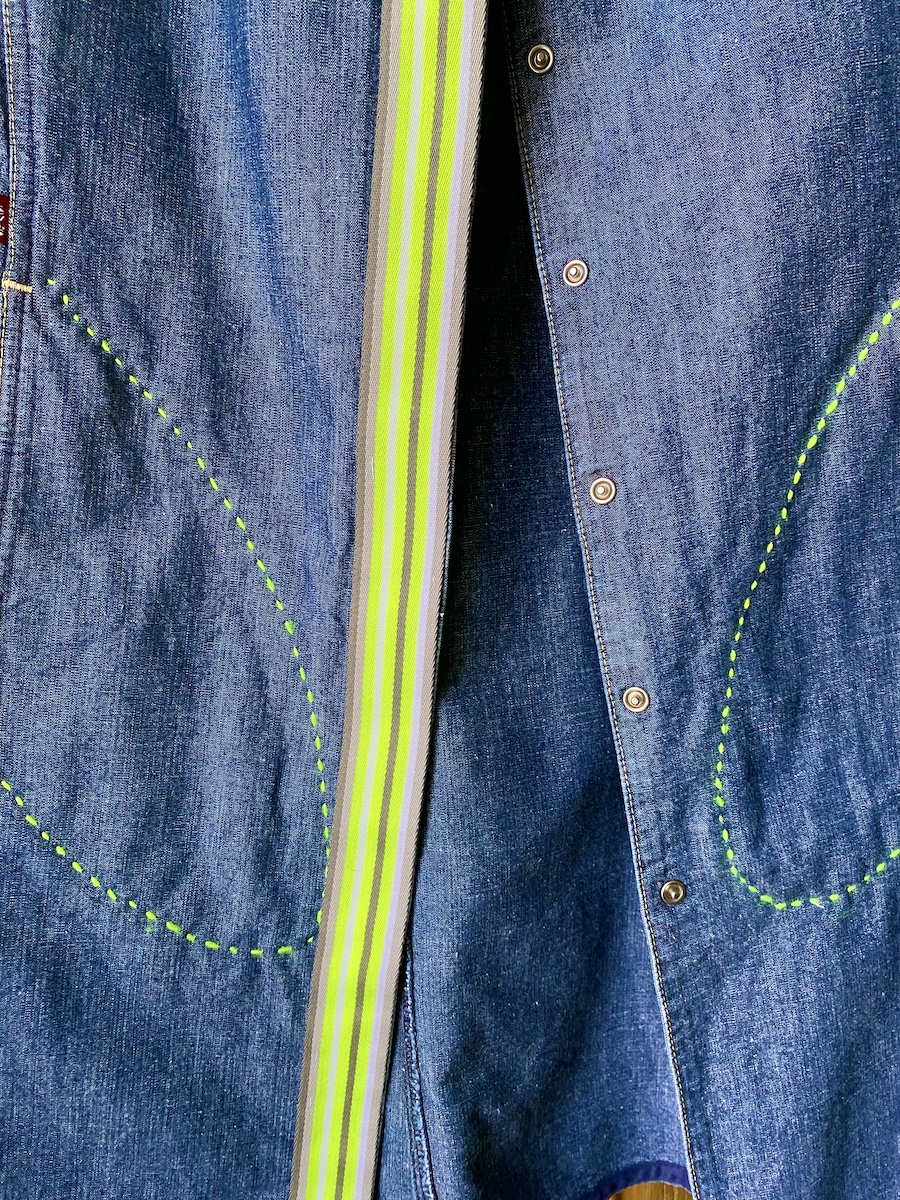 Donc pour la métamorphose, j’ai cherché à mettre en valeur sa coupe ergonomique. En effet les empiècements sont prévus pour envelopper délicatement les formes du corps, les mettre en valeur sans les appuyer. Je signale la réalisation: toutes les coutures latérales sont torsadées et les empiècements à pinces. L’upcycling, parfois est une réparation , et toujours un embellissement. Cette fois, la customisation personnalisera la pièce .J’aime beaucoup l’exercice qui consiste à transformer cette robe Levi’s iconique pour qu’elle ait une seconde vie. Je désirais lui ajouter de la valeur, sans rien lui enlever de ses forces . J’ai donc opté pour une bande de galon rayé jaune fluo, qui cache la bande de bouton pression. Je l’ai entièrement cousu à la main à points cachés. Puis j’ai simulé en broderie main toujours des poches, une poitrine et une sur une fesse. Les 2 poches lattérales existent, je les ai fixées et brodées sur le devant de la robe en denim. Petit plus: j’ai brodé un joli mot cache quelque part rien que pour l’acquéreur. Création 2025.