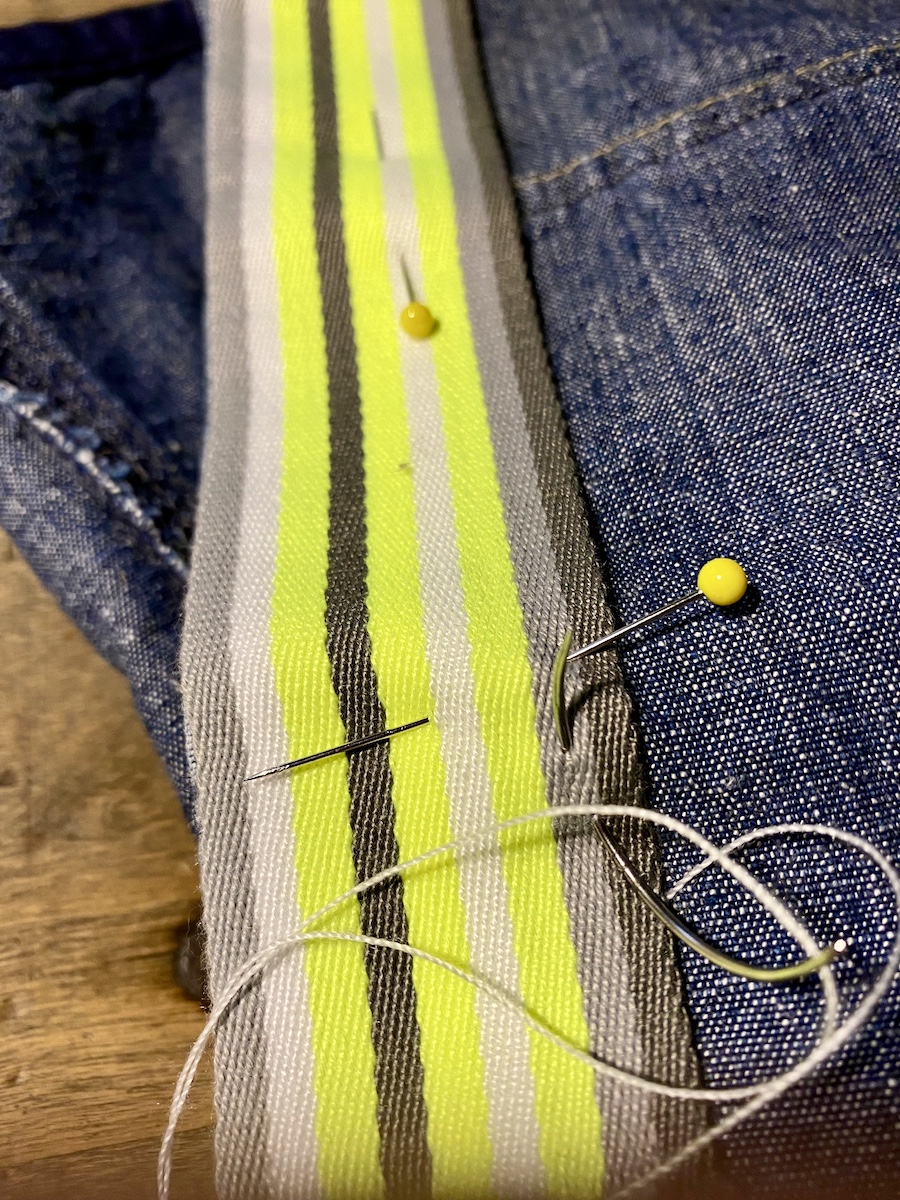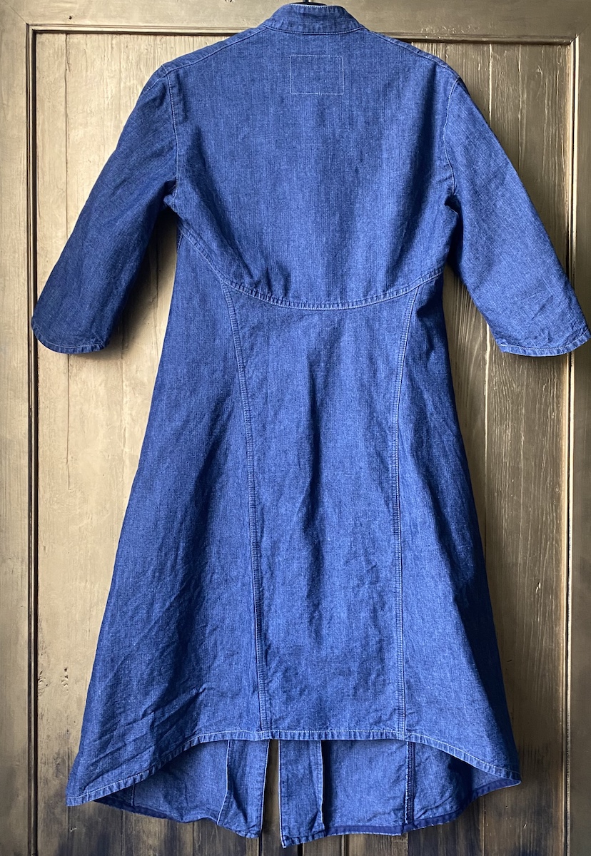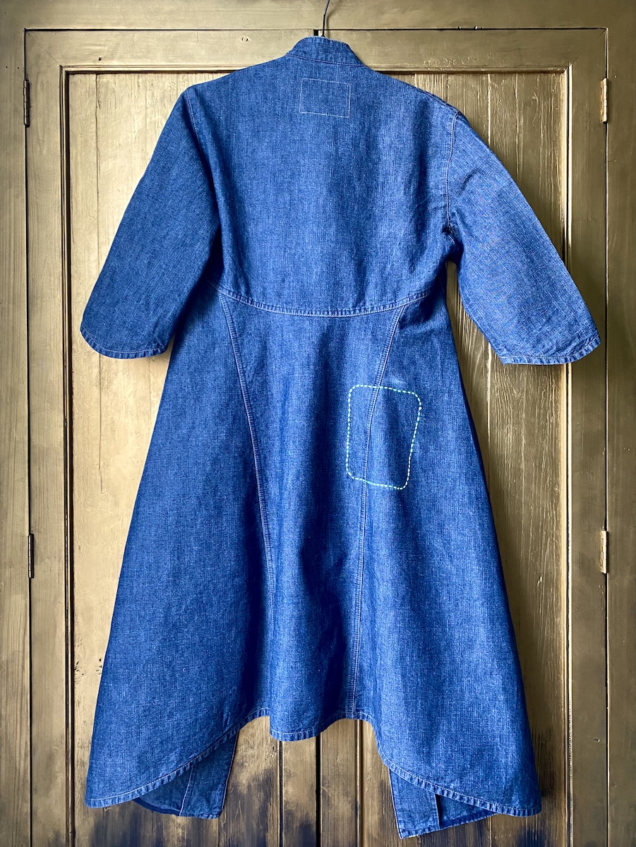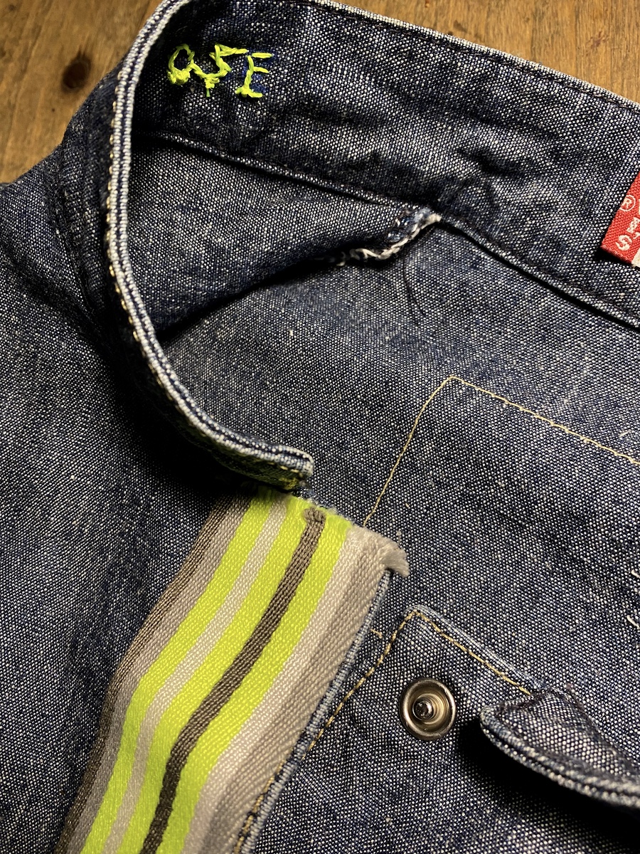 Donc pour la métamorphose, j’ai cherché à mettre en valeur sa coupe ergonomique. En effet les empiècements sont prévus pour envelopper délicatement les formes du corps, les mettre en valeur sans les appuyer. Je signale la réalisation: toutes les coutures latérales sont torsadées et les empiècements à pinces. L’upcycling, parfois est une réparation , et toujours un embellissement. Cette fois, la customisation personnalisera la pièce .J’aime beaucoup l’exercice qui consiste à transformer cette robe Levi’s iconique pour qu’elle ait une seconde vie. Je désirais lui ajouter de la valeur, sans rien lui enlever de ses forces . J’ai donc opté pour une bande de galon rayé jaune fluo, qui cache la bande de bouton pression. Je l’ai entièrement cousu à la main à points cachés. Puis j’ai simulé en broderie main toujours des poches, une poitrine et une sur une fesse. Les 2 poches lattérales existent, je les ai fixées et brodées sur le devant de la robe en denim. Petit plus: j’ai brodé un joli mot cache quelque part rien que pour l’acquéreur. Création 2025.