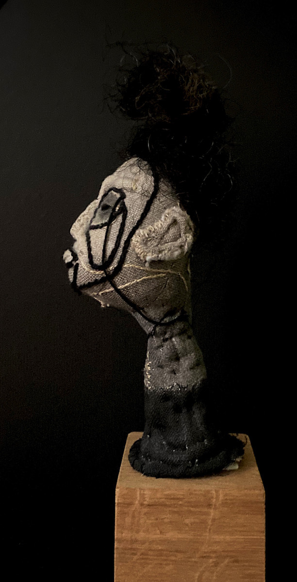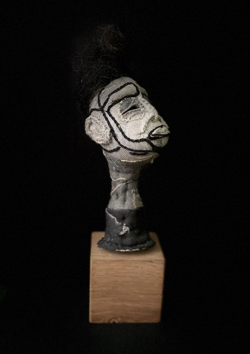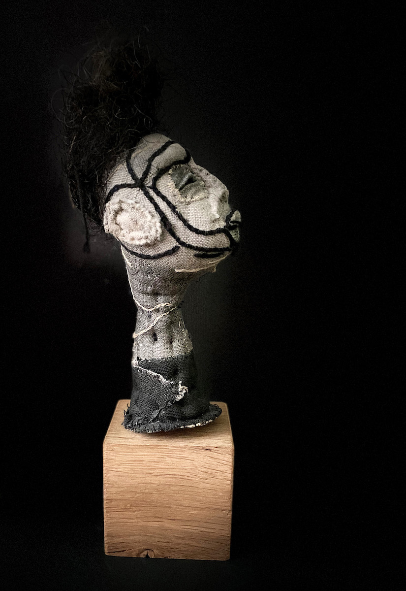 Art brut textile, cette sculpture âme chaman « Sangoma » est réalisée avec du lin recyclé, des ficelles de lin, et les fils de broderie sont de lin ou de coton épais noir. Après le travail de tapisserie, j’entame les broderies. À vrai dire, les broderies sont aussi utiles pour affiner les volumes. Car c’est en brodant que j’exécute des pinces et des replis de tissus , qui font partie de l’ornement. Et pour « Sangoma », j‘ai brodé de manière assymètrique au fil de coton noir sur le visage et le coup . Je l’ai également coiffé d’une chevelure en véritable crin de cheval noir.