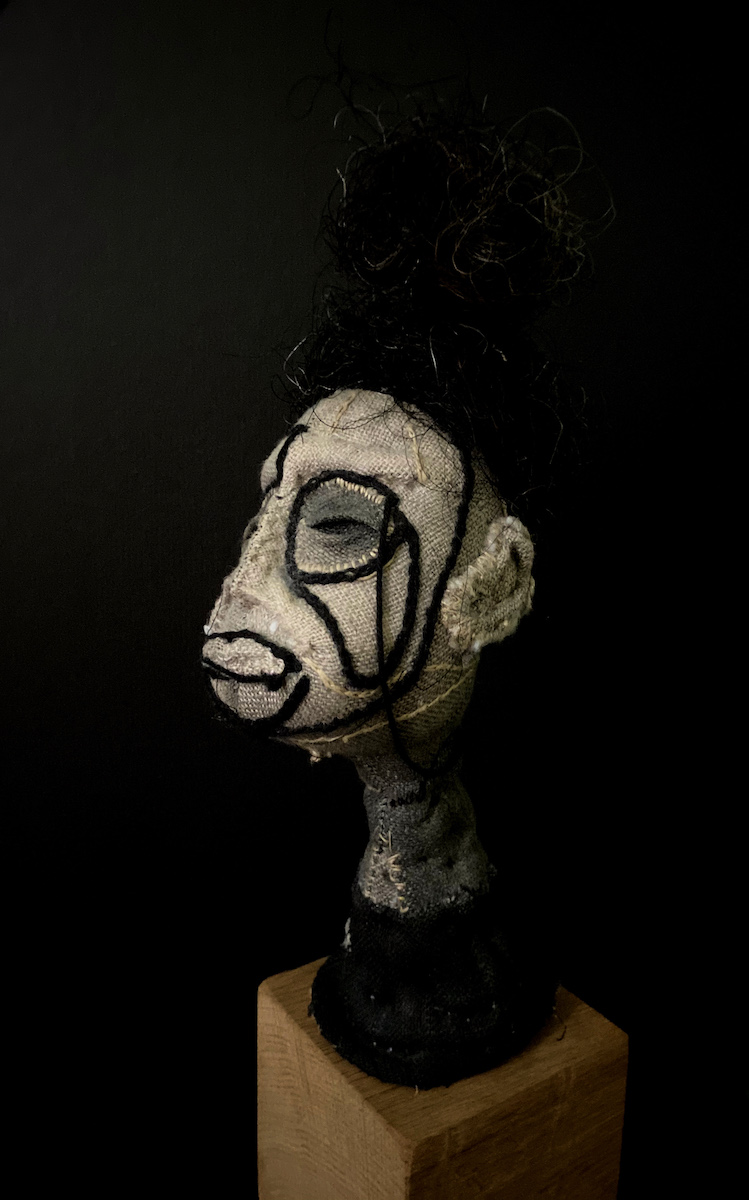 Cette oeuvre, Art brut textile, sculpture âme chaman « Sangoma » n°2, est une pièce de la série « Les âmes chamanes » .Et pour la créé, j’emprunte la technique et quelques outils qui sont ceux du tapissier d’ameublement. En premier, je dessine, puis élabore un patron qui préfigure la taille et le volume de la sculpture. Puis j’assemble les morceaux de tissu à la machine à coudre. Ensuite, je garni cette forme de ouate. Enfin le vrai « travail » de modelage commence. Avec les aiguilles double pointes du tapissier, je transperce l’épaisseur. Bien sûr j’utilise des ficelles de lin très solides et moyennement épaisses, qui résistent à une forte tension. Grâce à la tension et les noeuds spéciaux , peu à peu le portrait et ses traits se précisent.