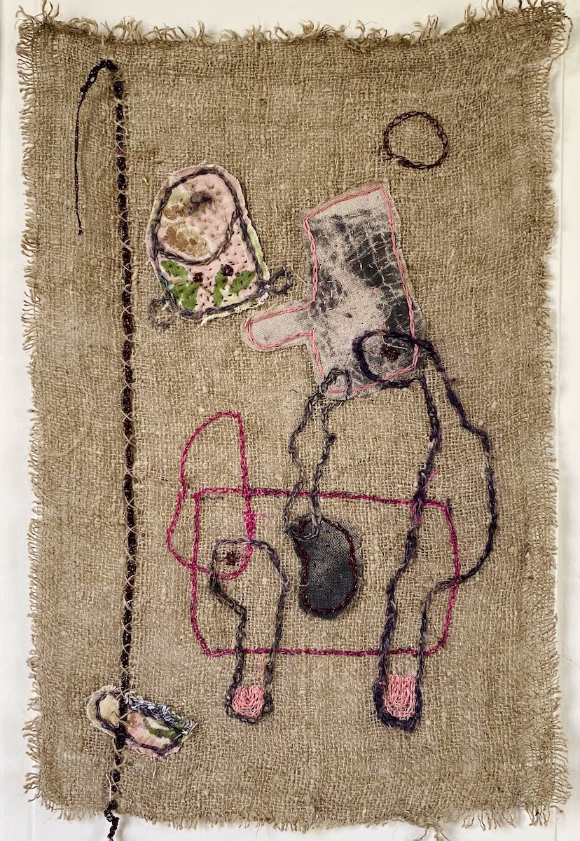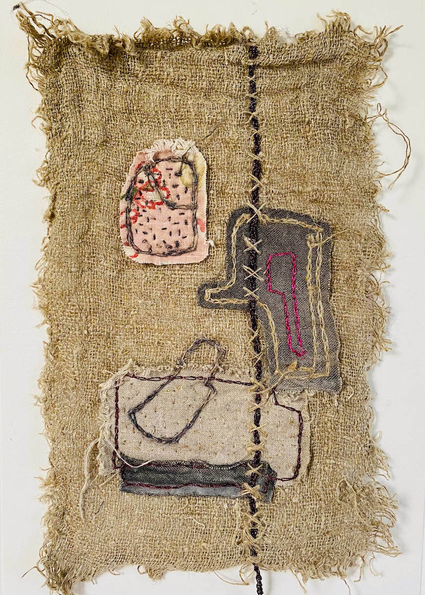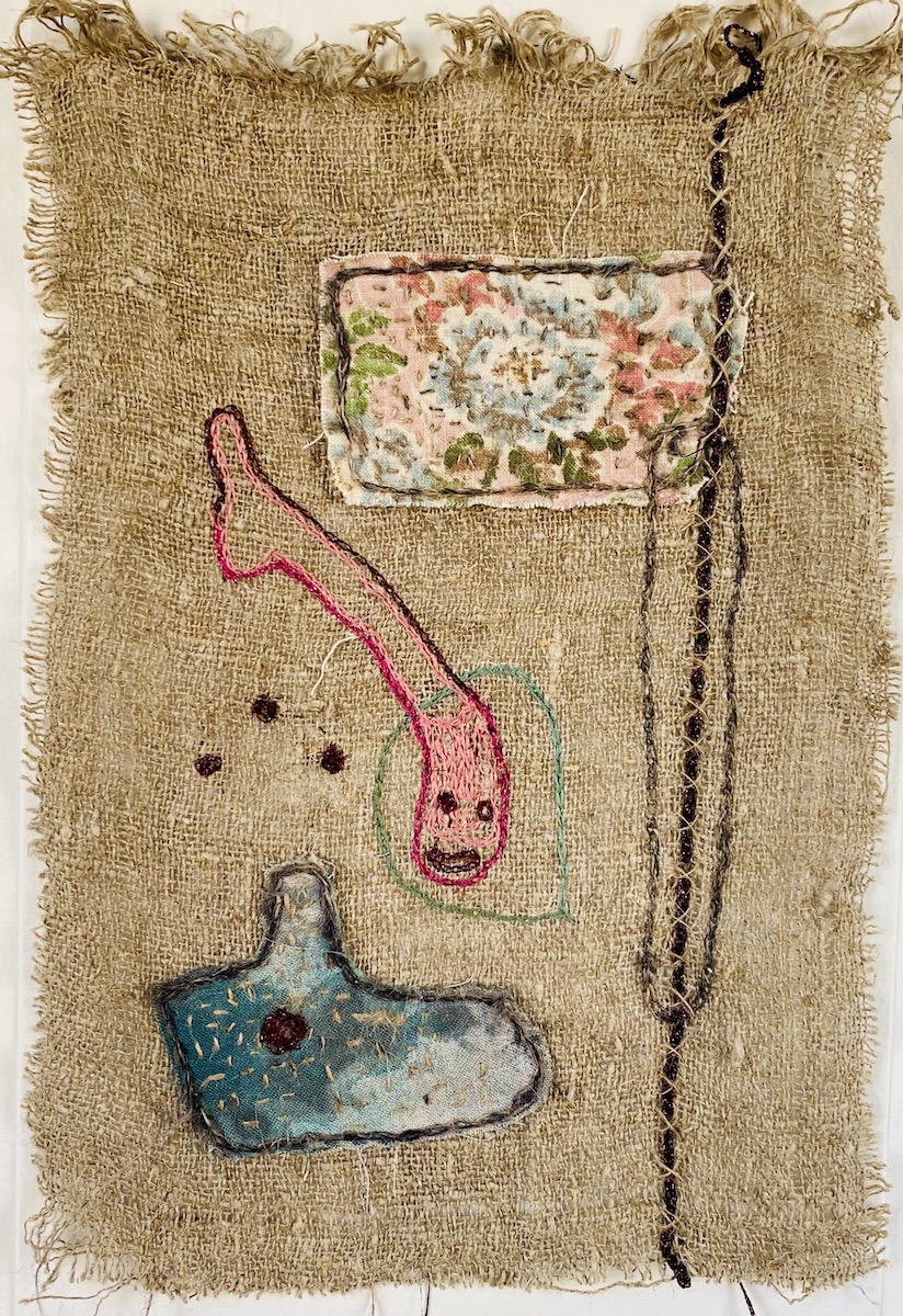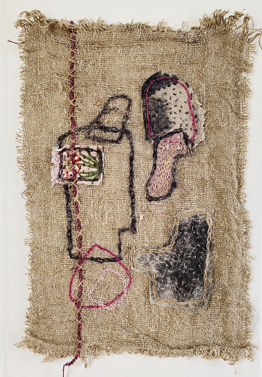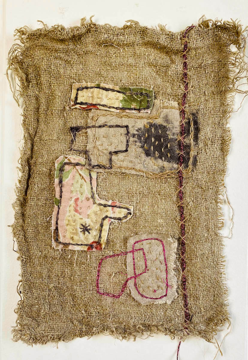Dans cette oeuvre textile brodée à la main, à l’esprit art brut, je brode en m’inspirant de la technique japonaise sashiko, sur de la toile jute et tissus d’éditeurs recyclés. Je cherche ici, à matérialiser la conscience et le contentement de l’impermanence et de la transformation de chaque chose. Ainsi, pour chacun de ses petits tableaux, pour illustrer le changement, l’évolution inévitable de chaque chose, j’ai choisi 3 formes différentes. J’applique ces trois formes soit sur le tissu, ou juste en broderie dans chacune des variations. Les tissus sont les mêmes et épousent des formes différentes dans chaque tableau textile. Puis je les dispose sur le fond, je brode, je pique, à chaque petite oeuvre textile brodée sa particularité. La disposition, les broderies d’ornements, les fils brut et irisés participent à l’évolution, la transformation des items. Le code couleur est également le même dans chaque variation. Ces 8 variations peuvent être séparées ou réunies dans un grand encadrement entre deux verres par exemple. Art brut, art spirituel.