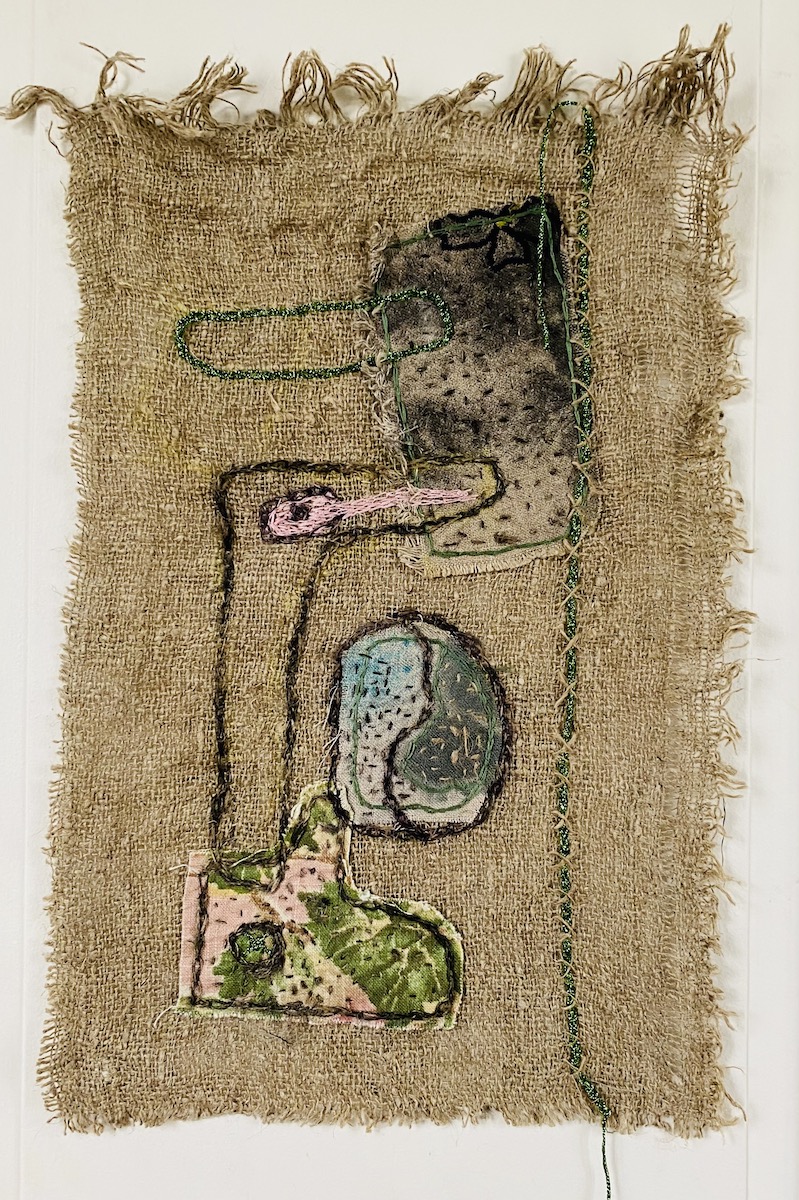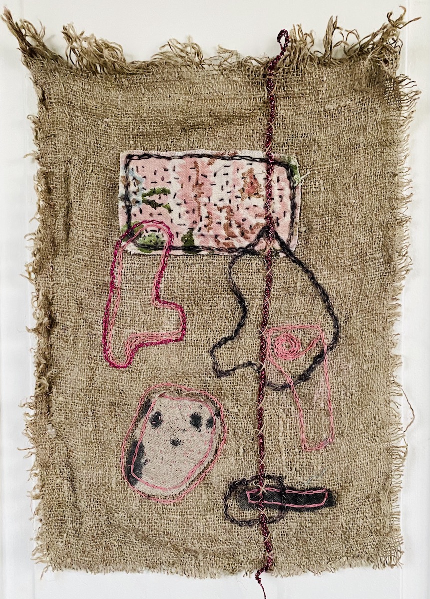 Tableau brodé, art textile, broderie à la main sur jute et tissus d’éditeurs recyclés, série « les imprèdictibles » 19×27 cm, n°4, « Gun », 70 €
