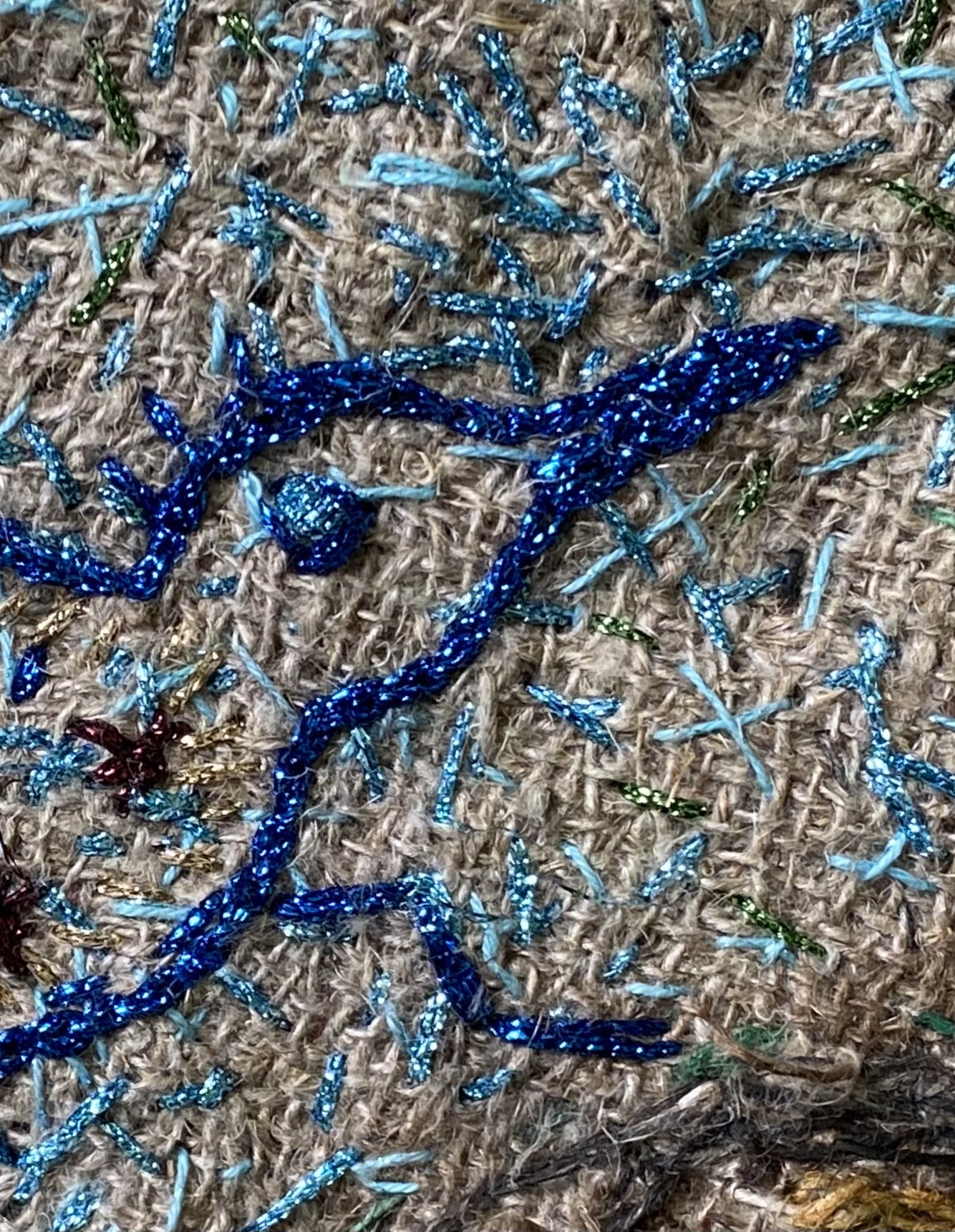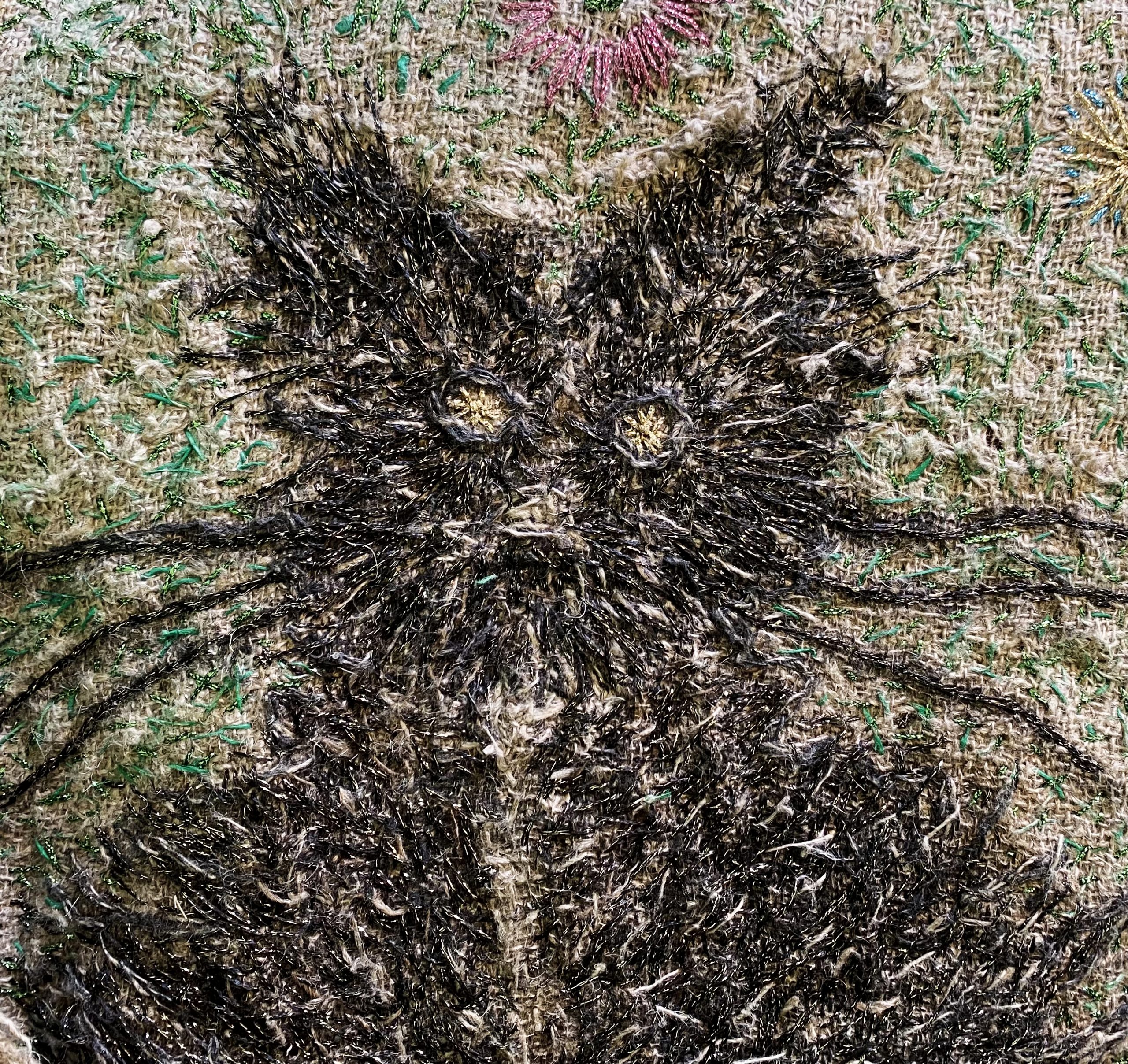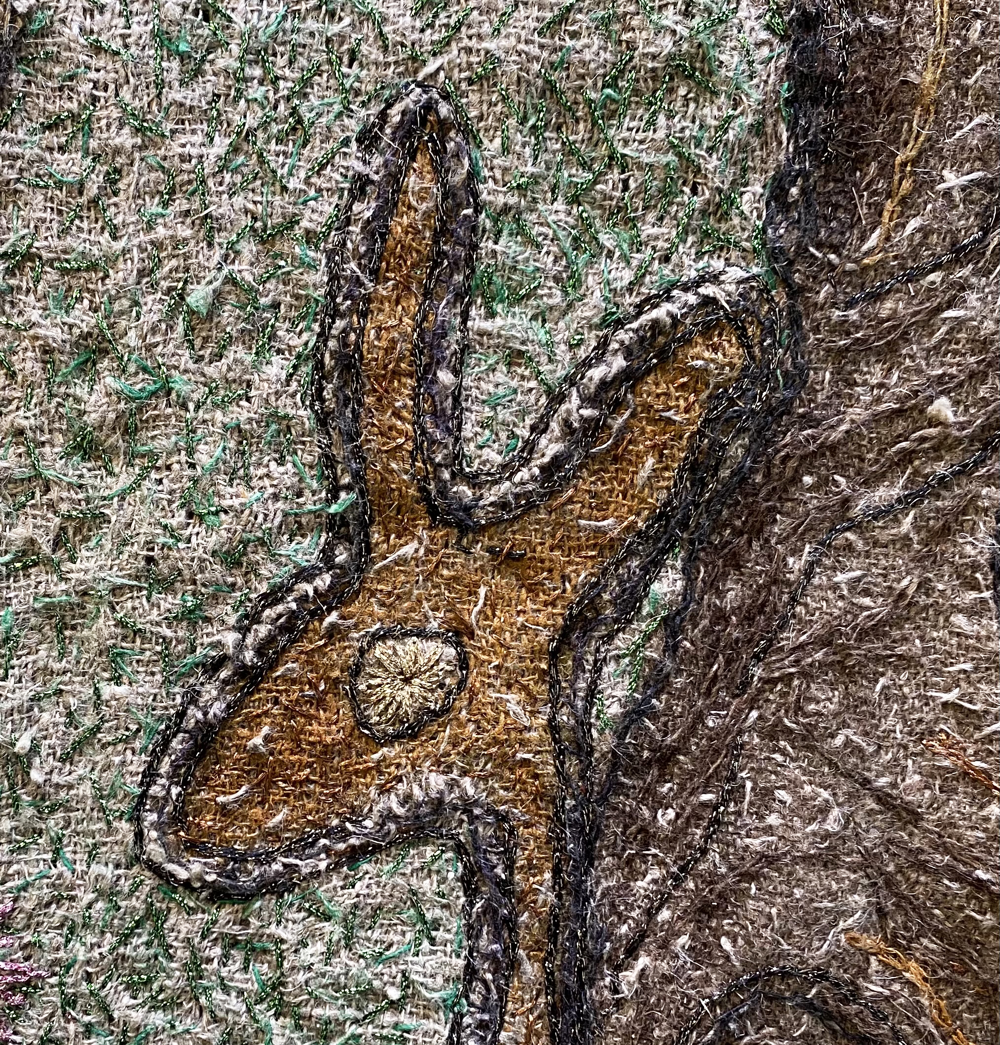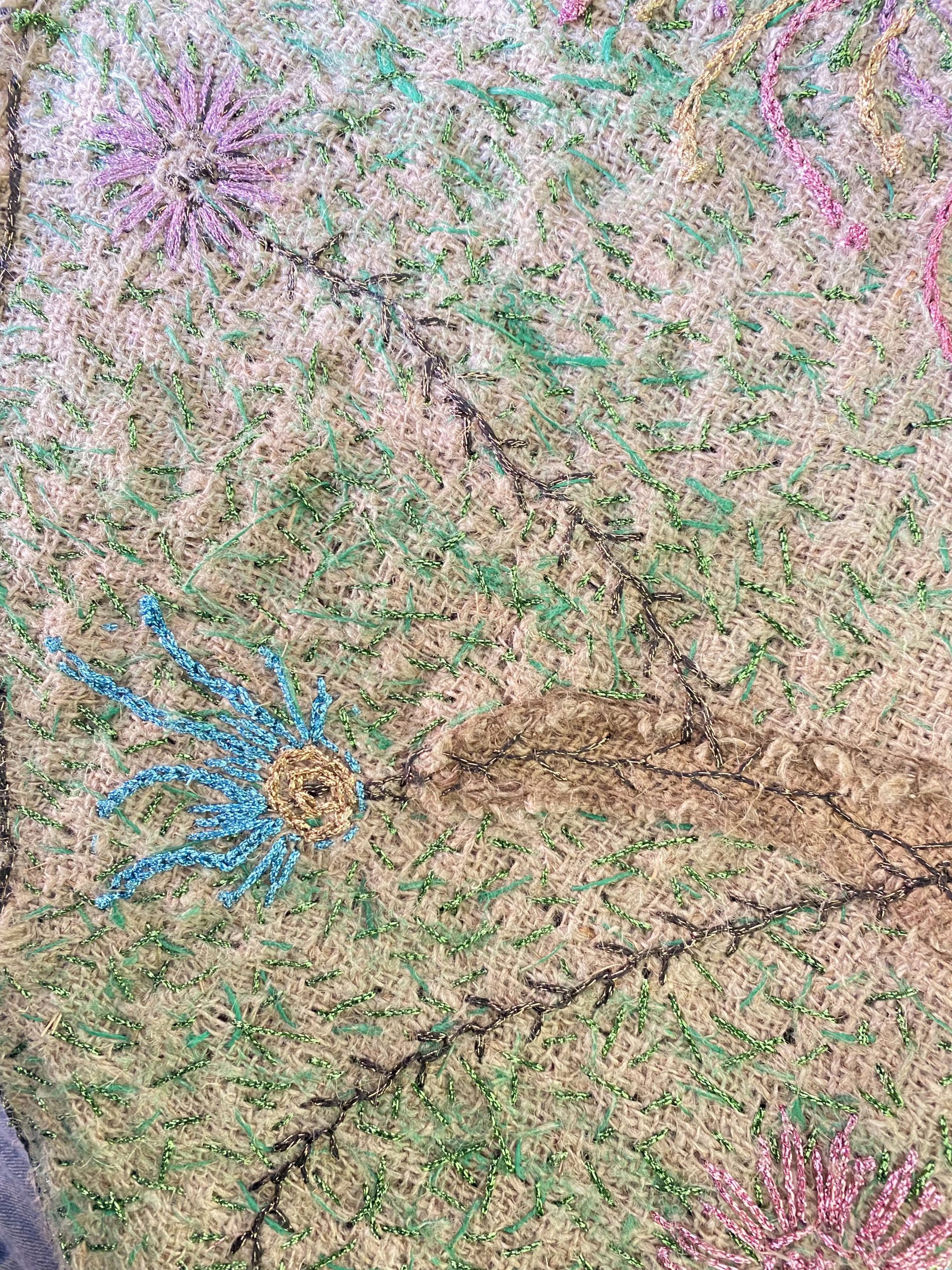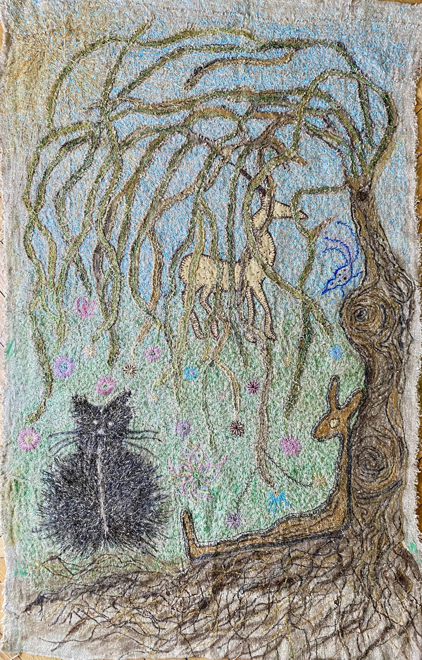 Donc j’ai brodé cette scène féérique sur de la jute lavée . Je procède par superposition et assemblage de tissu. Au préalable j’ai dessiné le saule sur une toile de jute et l’ai découpé. Puis j’ai brodé à la main sur la toile de fond. Au fur et à mesure j’ajoute et brode les animaux :le lapin, le chat, l’antilope. C’est à la fin que j’ai fleuri la tapisserie. Les fils que j’utilise sont des fils de lurex principalement. Et également des fils de jute que je prépare en amont. Certains sont teints. Pas à pas ou plutôt point par point la tenture prend vie. Et j’ai brodé le point de chainette, le point d’épine, passé plats pour les fleurs, le point de noeud, d’alvéole. De plus, j’ai entièrement entoilé la tapisserie en la surpiquant à la main. Une bande passant est prévu pour la suspendre en tenture . L’idéal étant de l’enfiler sur un bambou ou une belle branche du jardin.