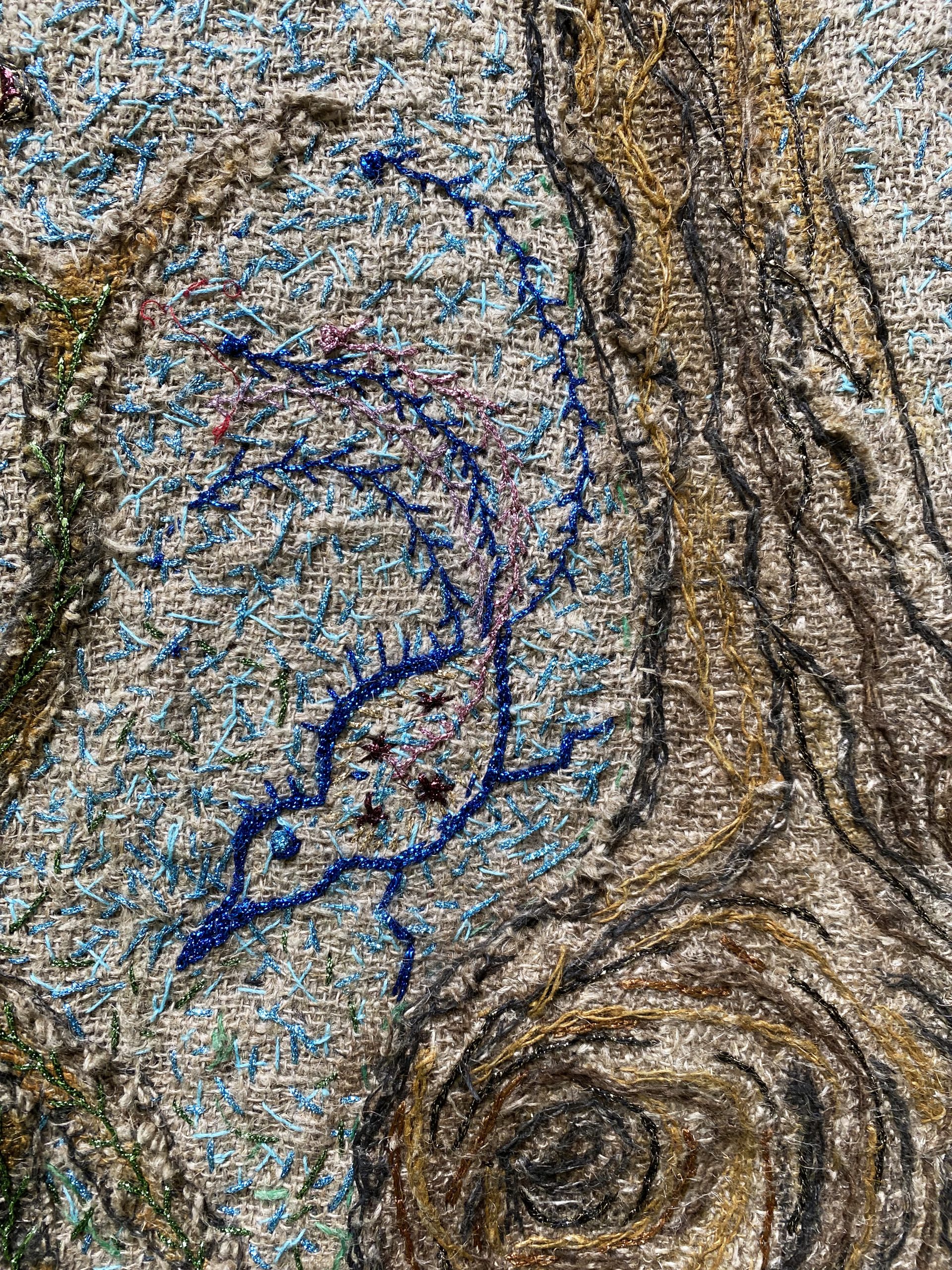 Long travail de broderie sur une première toile, puis entoilage et broderie, chaque centimètre carré est brodé de fils de jute naturel ou teints et fils de lurex. Nord, sud, est, ouest, ce tableau multiplie tous les sens, selon l’humeur.