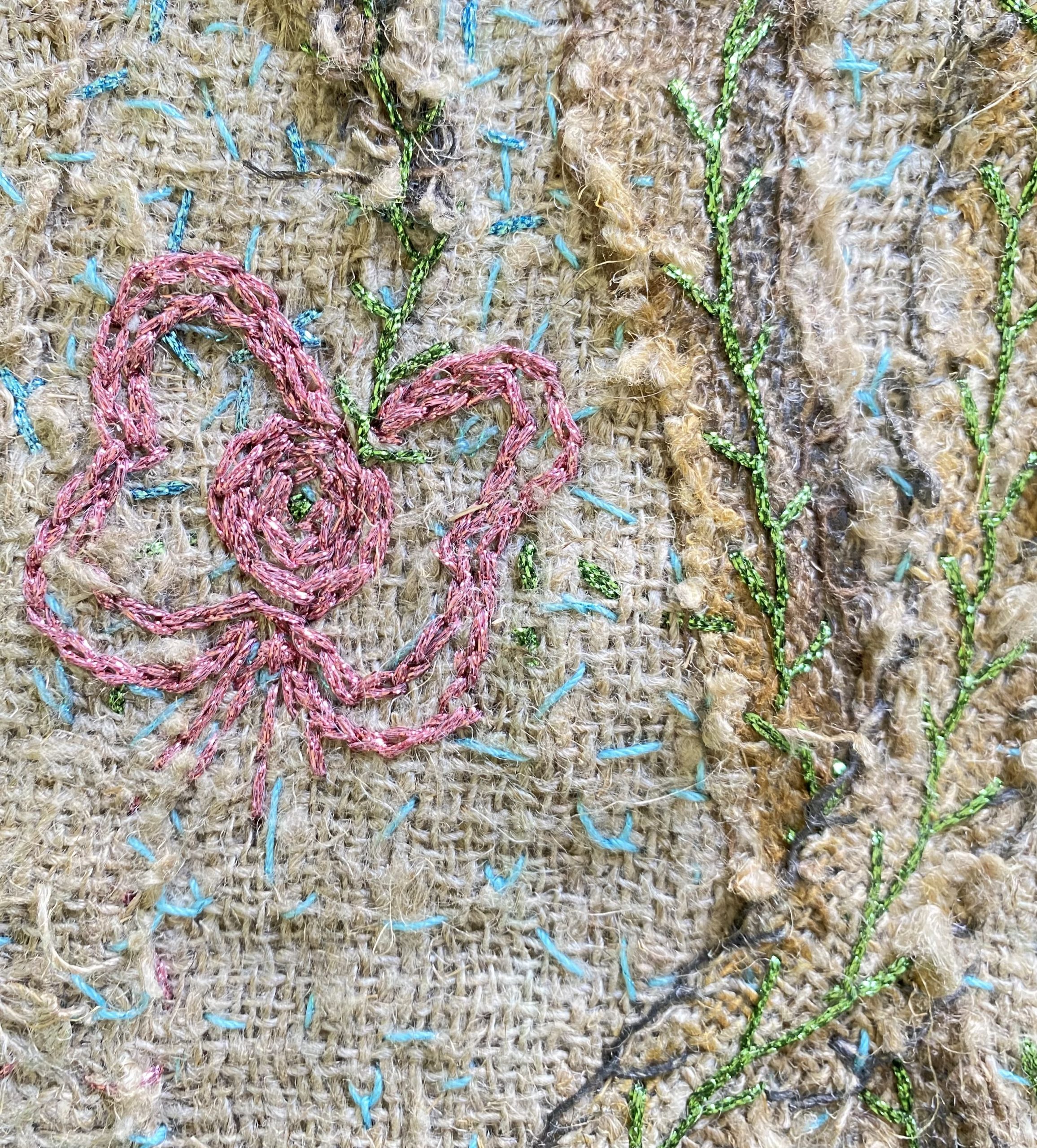 Petite guenille magnifiée, chutes recyclées et broderies 39×26 cm.