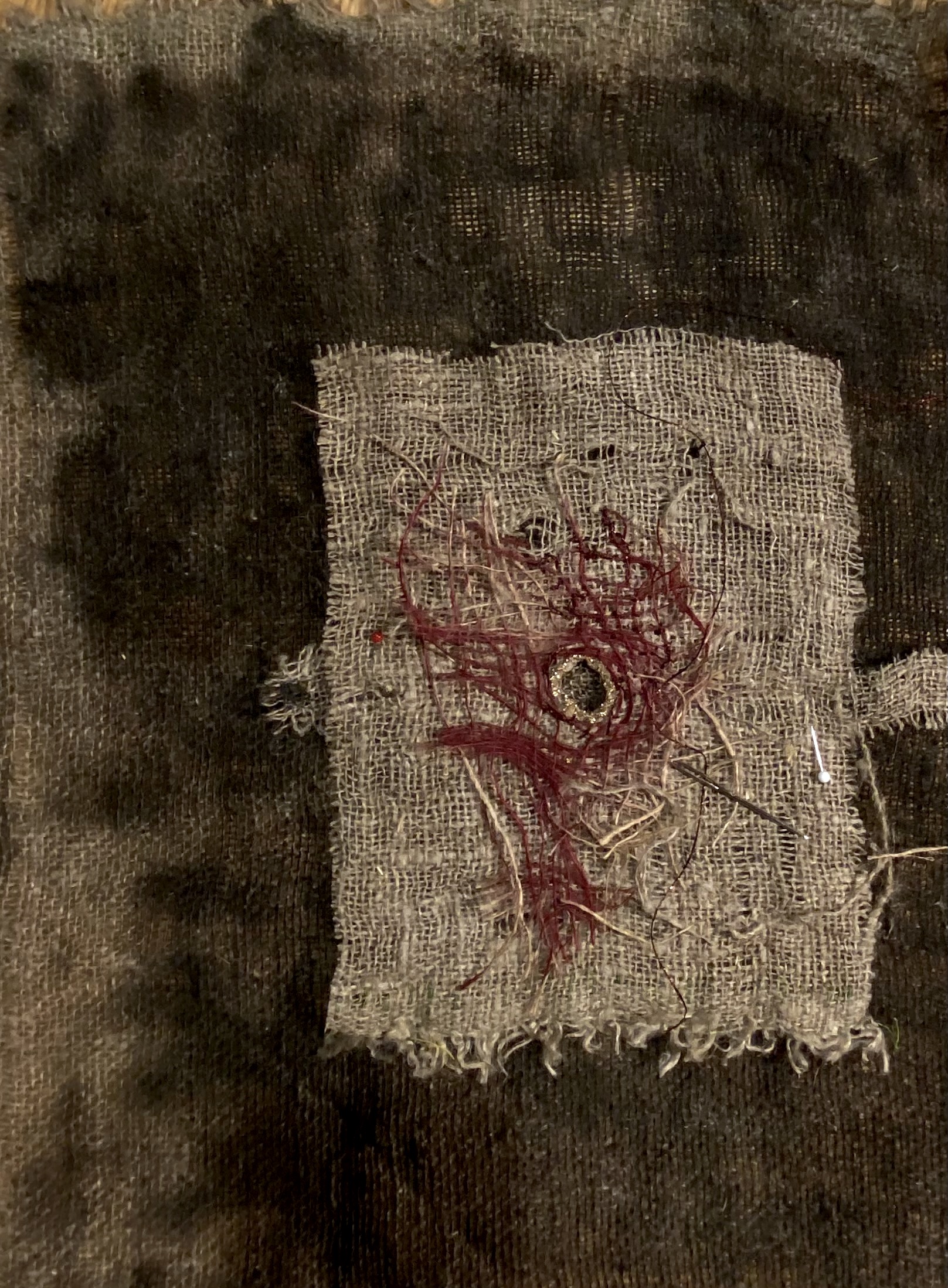 Pour la confection, je brode sur de la toile de jute lavée, et teintée parfois. Les teintures faites manuellement sont naturelles de brou de noix , café et the, betterave. J’utilise librement la technique japonaise de rapiéçage appelée sashiko. Je superpose les chutes que je pique à la main au fur et à mesure. Au préalable je prépare les fils, naturels ou teints. J’ai joué sur les tons naturelles et presque anthracite qui peu à peu se mélangent. Au centre, j’ai représenté, abstraitement, le tas de feuilles rubis à terre. La broderie tenture art brut « Rubis automnale » est dans la dernière phase entoilée dans sa totalité. En effet l’entoilage , brodé à petits points centimètre par centimètre , confère de la tenue à la tenture. Il participe également à fignoler des détails.