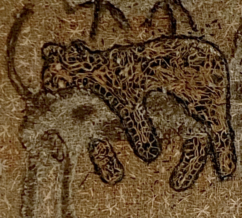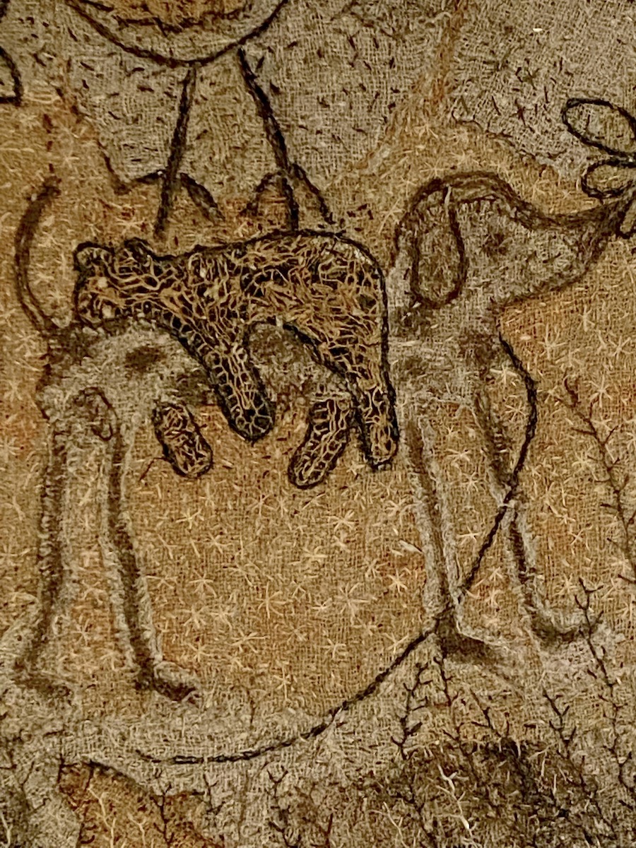 J’ai brodé cette tenture avec la technique de rapiéçage japonaise appelée sashiko, également aux points de chainette, d’échelles ainsi qu’au point d’épines, Et j’ai utilisé des toiles de jute, lavées, teintées manuellement avec de brou de noix, de l’ocre et quelques paillettes. Il s’agit pour moi de m’amuser à superposer des couches de jutes, et de les maintenir à petits points. Je prépare également les fils de jute à l’avance. Parfois il peut y avoir jusqu’a 4 couches de tissu. Je brode petit à petit. Enfin, lors de la dernière étape, j’entoile entièrement la tenture brodée sashiko, chien et chat, au dos. À ce moment là, je commence le travail laborieux de broderie qui maintient toutes les épaisseurs et donne la tenue .