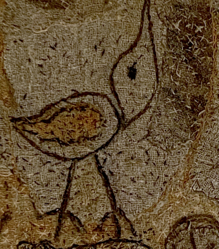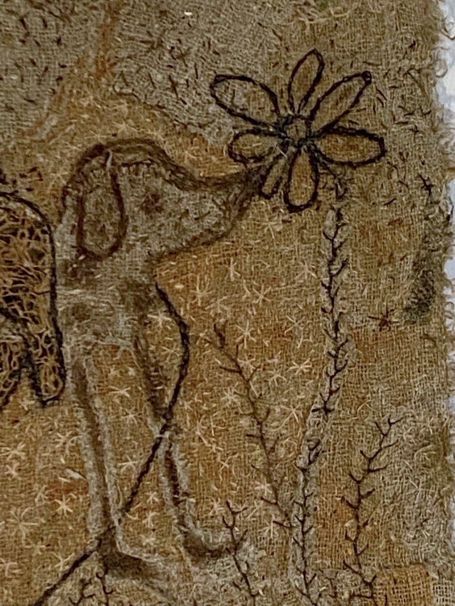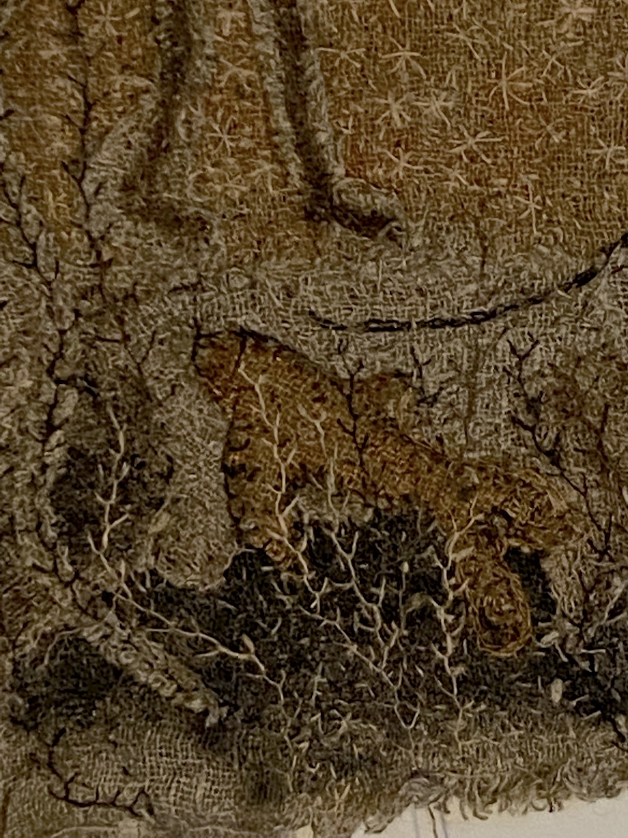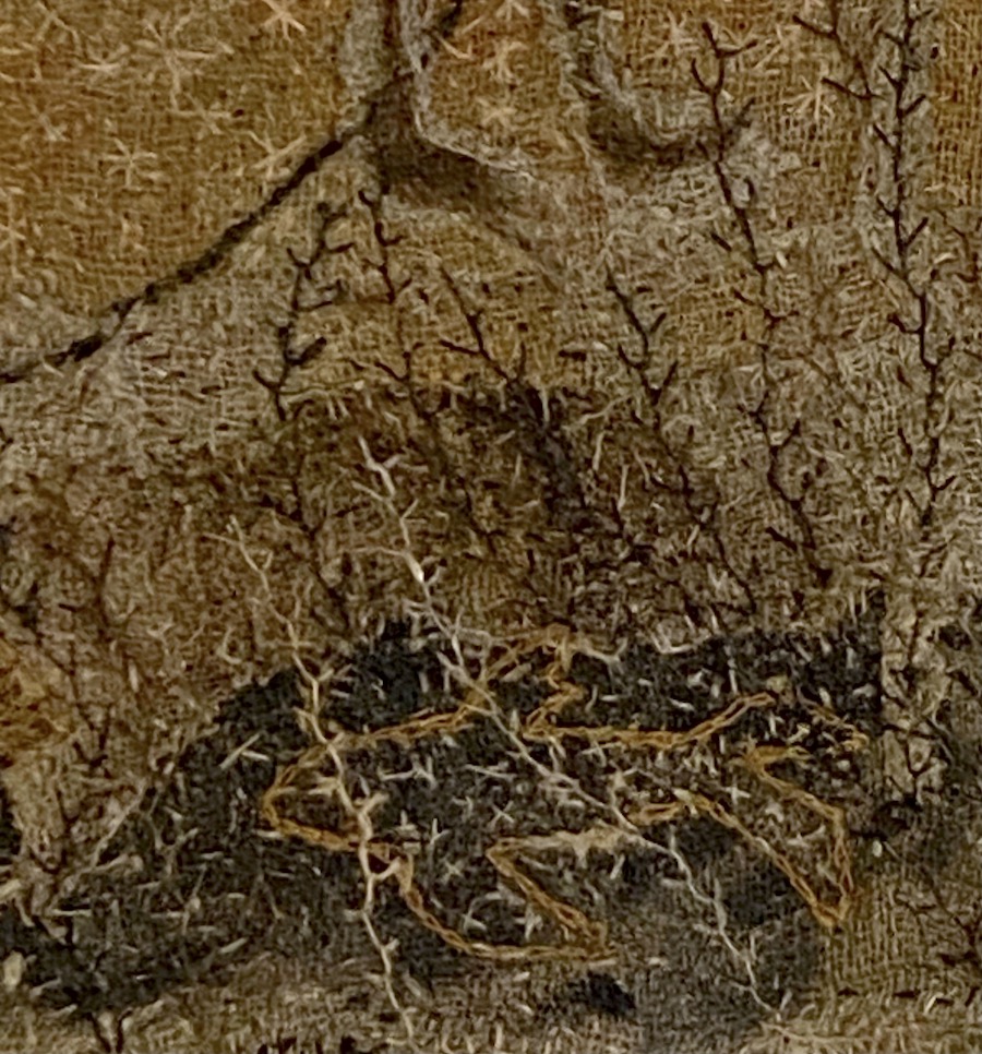Pas un centimètre de la tenture n’est pas brodé à nouveau . Lors de cette étape, je peaufine et raffine les détails en utilisant des fils naturels ou bien teintés.