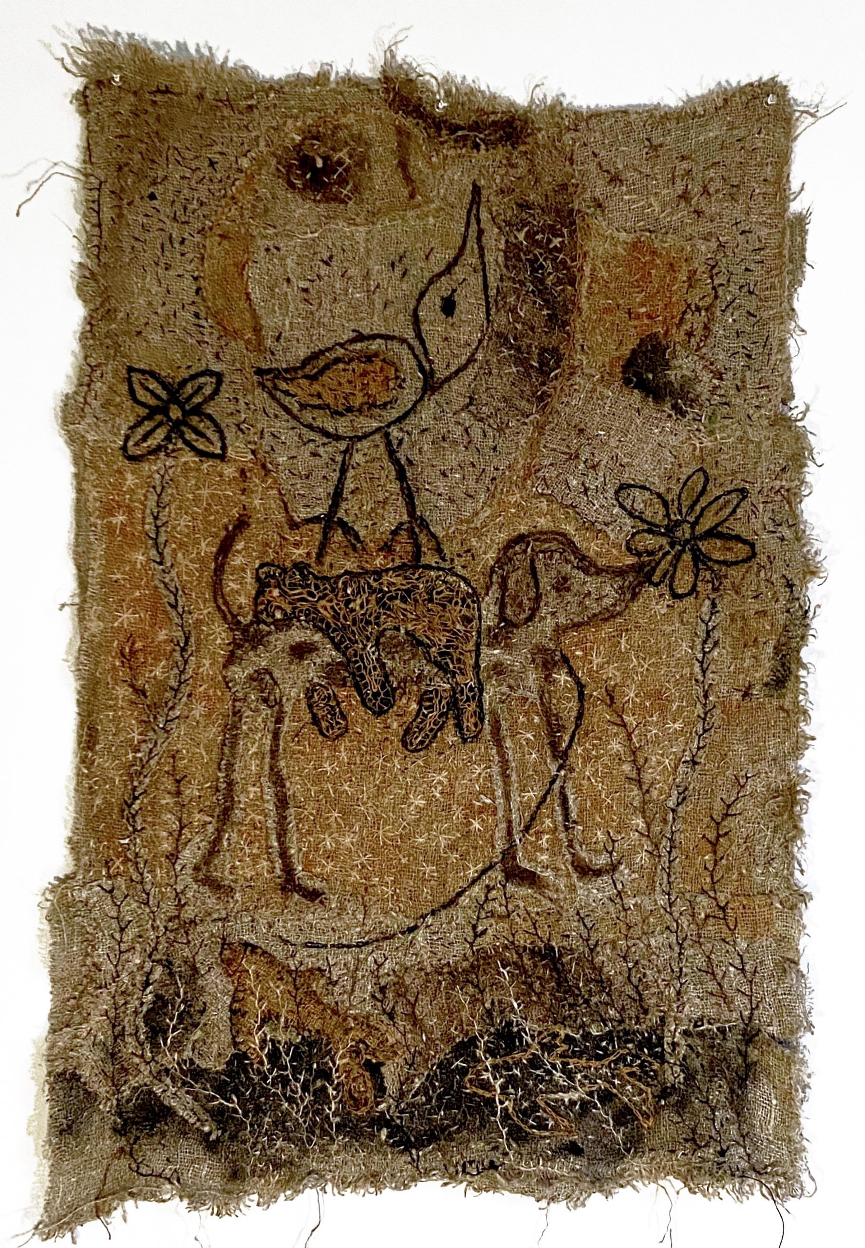 TENTURE BRODÉE SASHIKO « CHIEN ET CHAT » ART BRUT