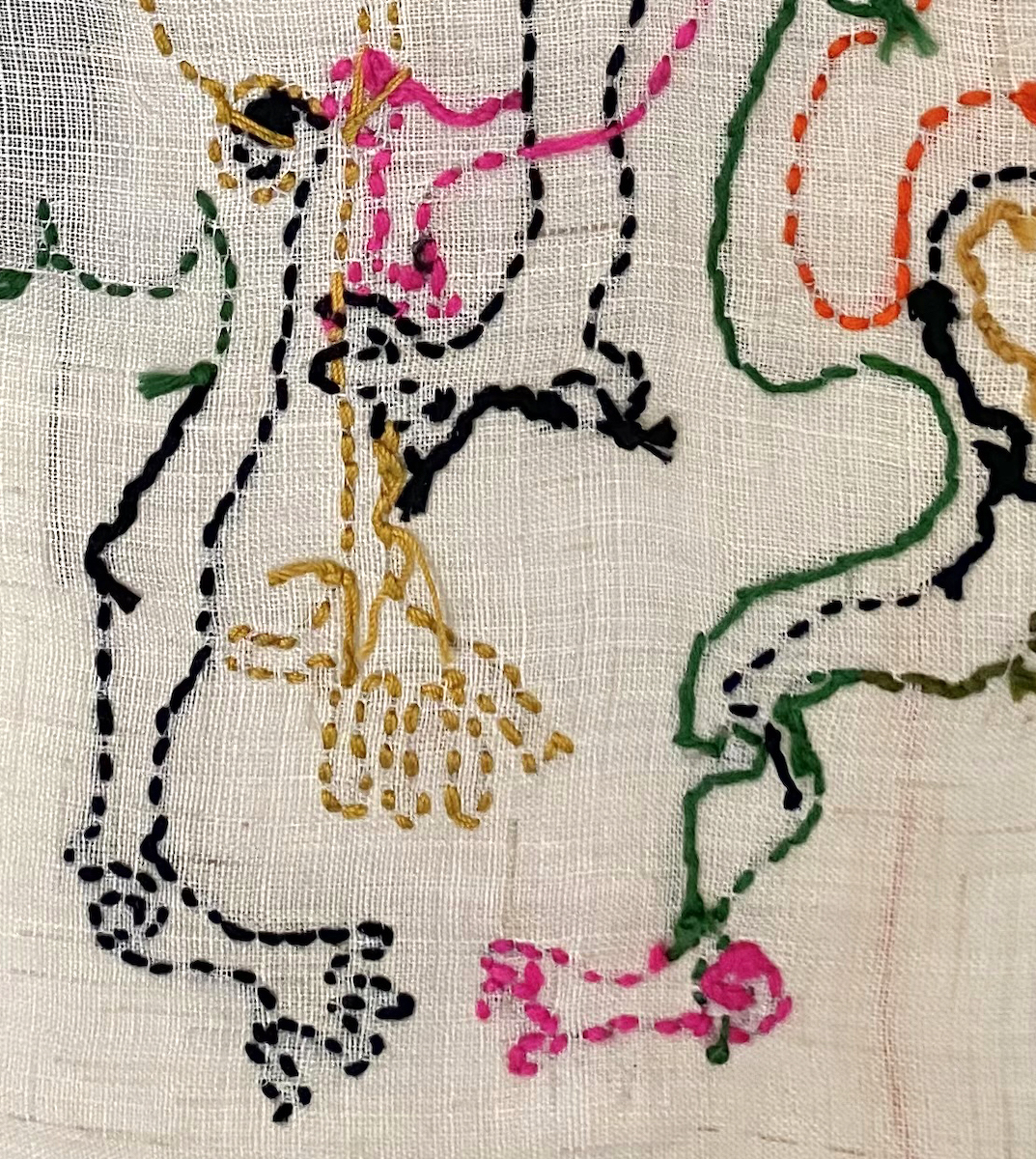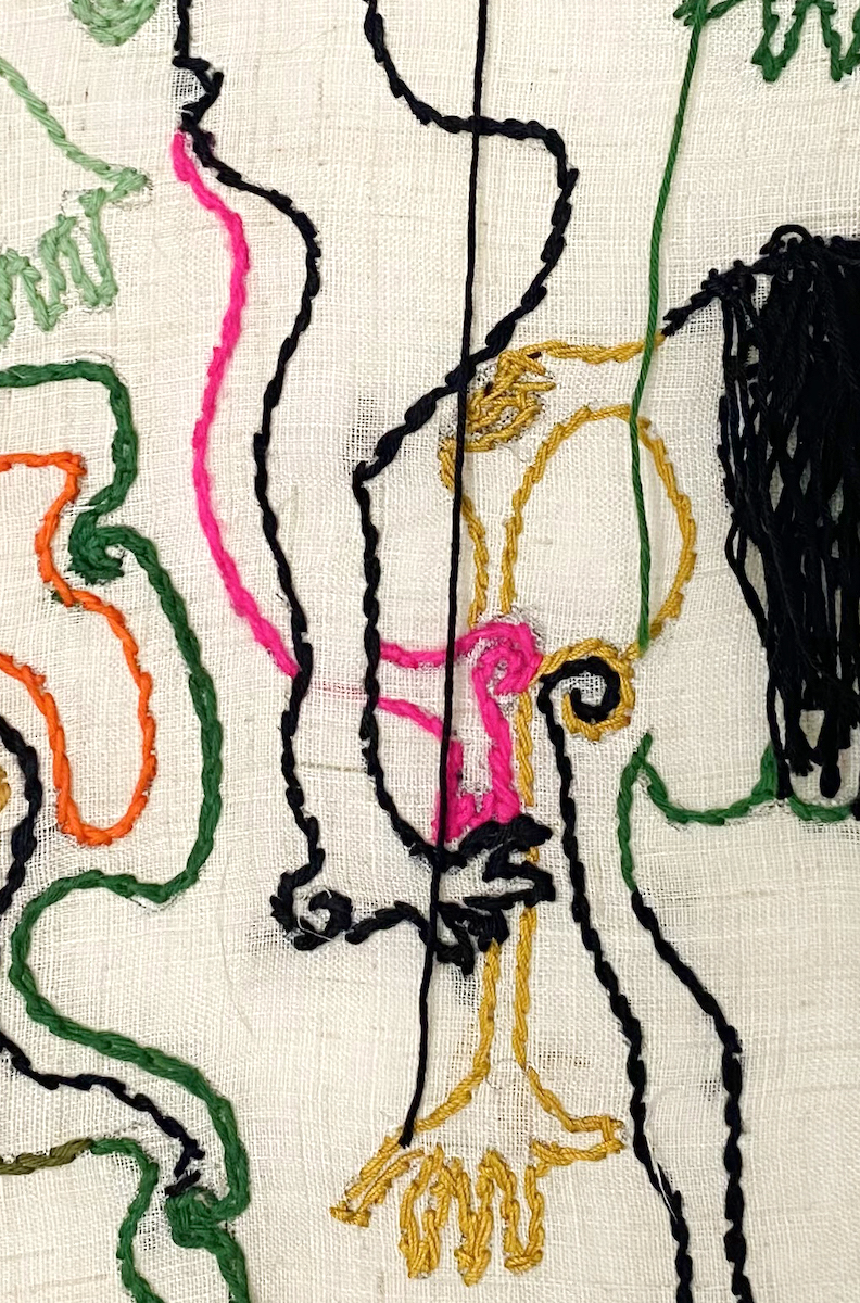 - Étiquettes: Art brut, art textile, broderie main , fil de laine, tissage, fibre, illustration, graphisme, abaca, bananier, trance, danseurs, point de tige,tapisserie.
