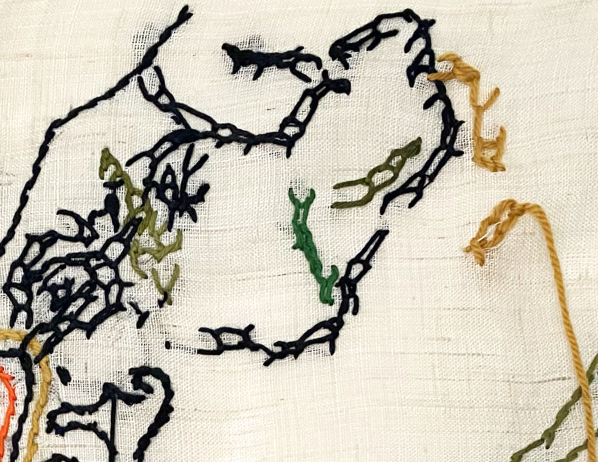 J’ai opté pour une broderie au point de tige principalement pour cette Transe brodée. Et l’aiguille file sur de l’ Abaca, un tissage de fibre issue d’une variété de bananier). J’y enfile des fils de laine essentiellement et de coton. Je considère cette oeuvre plutôt art brut, tant à cause du graphisme très intuitif et réalisé au feutre, que de la couture à points en laine. En effet, je mixe la « sécheresse » et la délicatesse du tissage subtilement irrégulier du « chanvre de Manille », avec la douceur des fils 100% laine. C’est aussi la raison pour laquelle je brode avec le point de tige. En effet, il apporte selon là où je pique l’aiguille, un léger relief, tout en ne s’étalant pas. De ce fait, comme le feutre sur le carnet, le fil glisse, fluide sur le tissu.