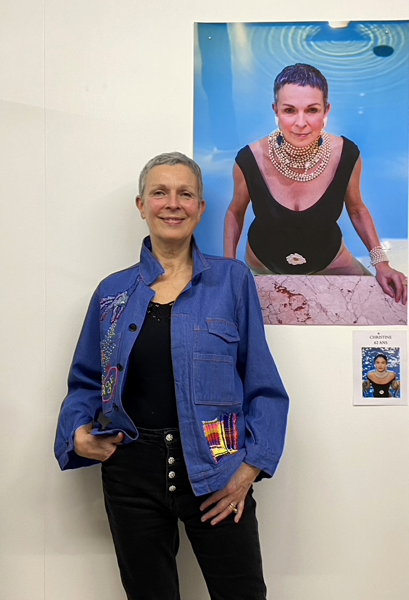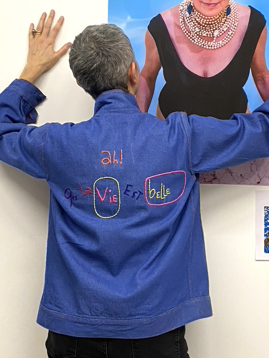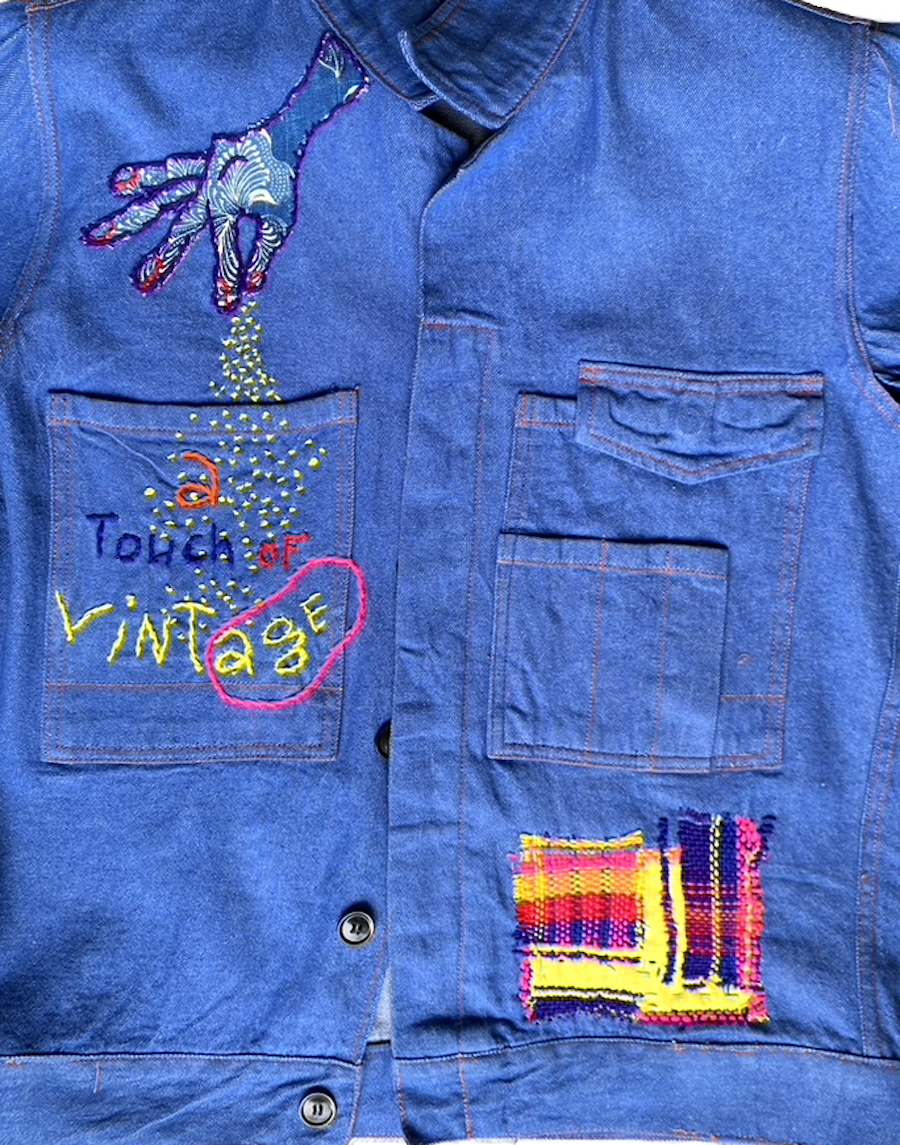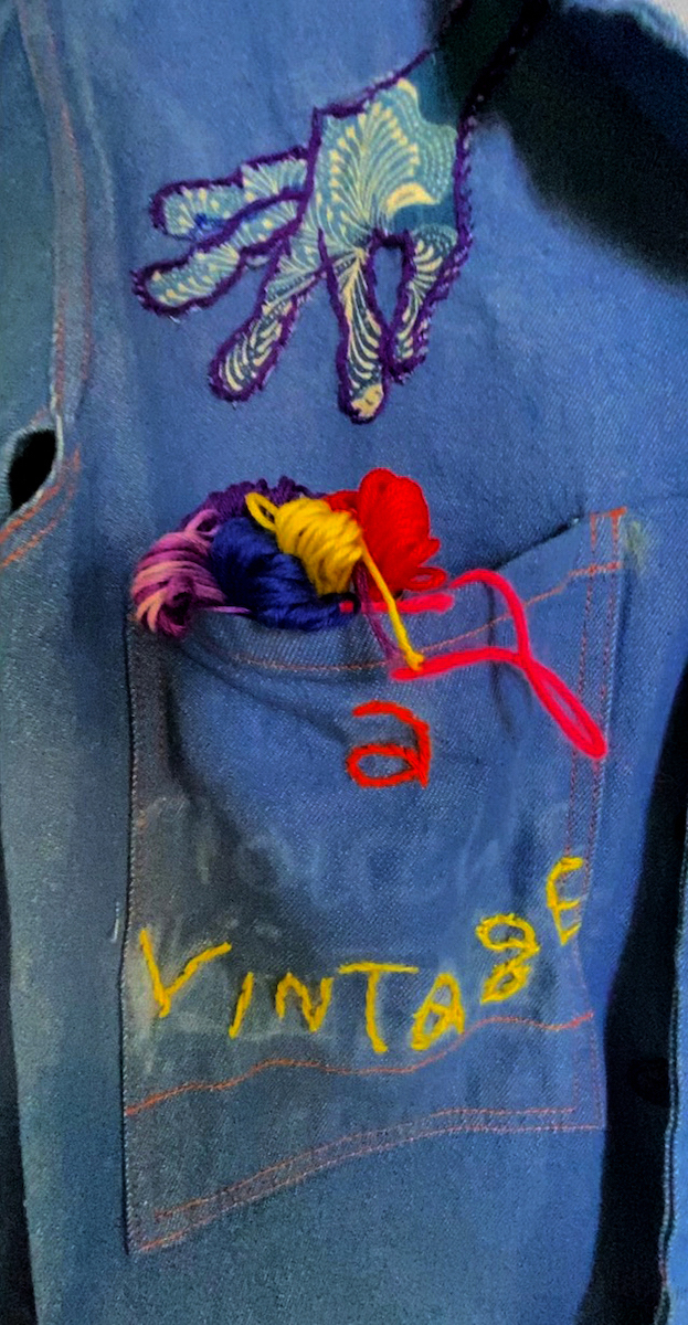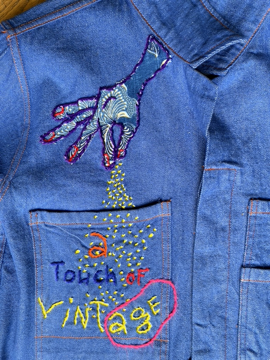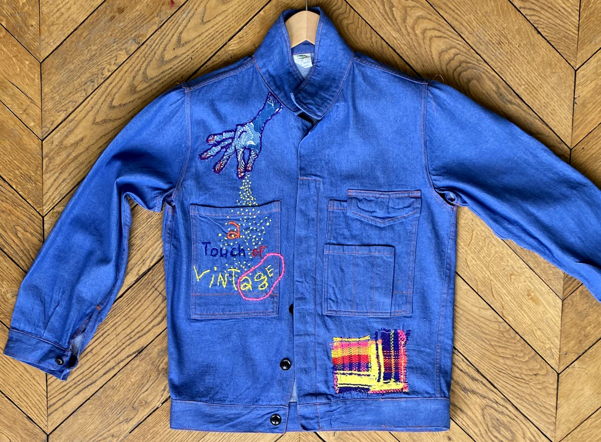 J’ai imaginé cette veste vintage upcycling pour le collectif « C’est pas demain la vieille » initié par Sandrine Alouf, atmosphériste. À l’origine, il s’agit d’un blouson déniché, issu d’un lot non usager. Donc je l’ai décousu et démonté pour retirer les élastiques et remonté! afin de le transformer en veste plus moderne. L’upcycling consiste à magnifier un vêtement (par exemple). C’est le principe wabisabi japonais, faire du neuf à partir du vieux tout en lui ajoutant plus de valeur. Ainsi, j’ai choisi d’illustrer le propos du collectif , celui de militer pour changer le regard que la société accorde au fait de vieillir. Et plus particulièrement, l’invisibilité des femmes dont l’âge dépasse les 50 ans.