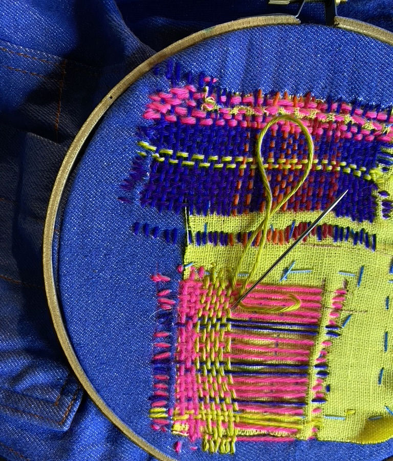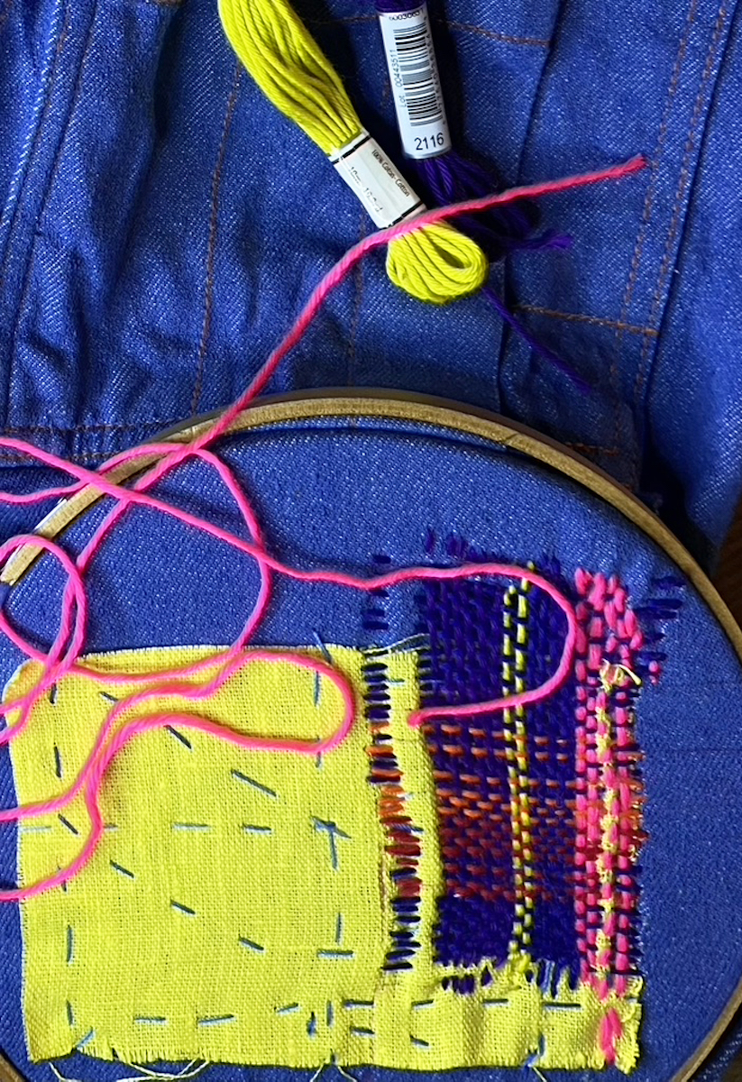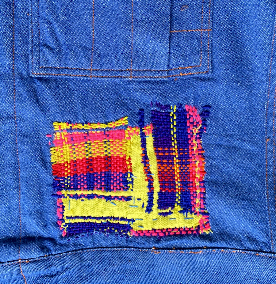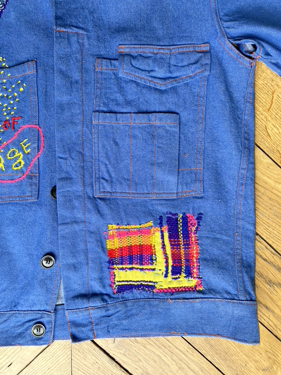 Une fois l’inspiration là, je commence la broderie de cette nouvelle future veste vintage upcycling. J’ai commencé par dessiner une main que je décide de découper dans une chute de tissu d’éditeur (pierre frey). Puis j’applique cette main et la brode aux pourtours d’un fil de laine violet. Je lui « ferais » les ongles en rouge plus tard. Je couds au point de tige. Sur la poche, je brode de plusieurs couleurs, alternant les tons sombres(bleu et violet) avec des couleurs très vive, jusqu’au rose fluo, pour le pep’s. Puis sous la poche à droite, j’ai appliqué une chute de lin jaune citron. Et là, j’ai commencé à broder contre l’obsoléscence , selon la technique appelée » visible mending ». C’est un procédé de racommodage visible assez fastidieux et qui prends du temps! Je monte un trame avec des fils de différentes couleurs selon un rythme que je définis ou plutôt qui s’impose au fur et à mesure. Puis je tisse avec des fils différents en les entrecroisant. J’obtiens une sorte de tartan.